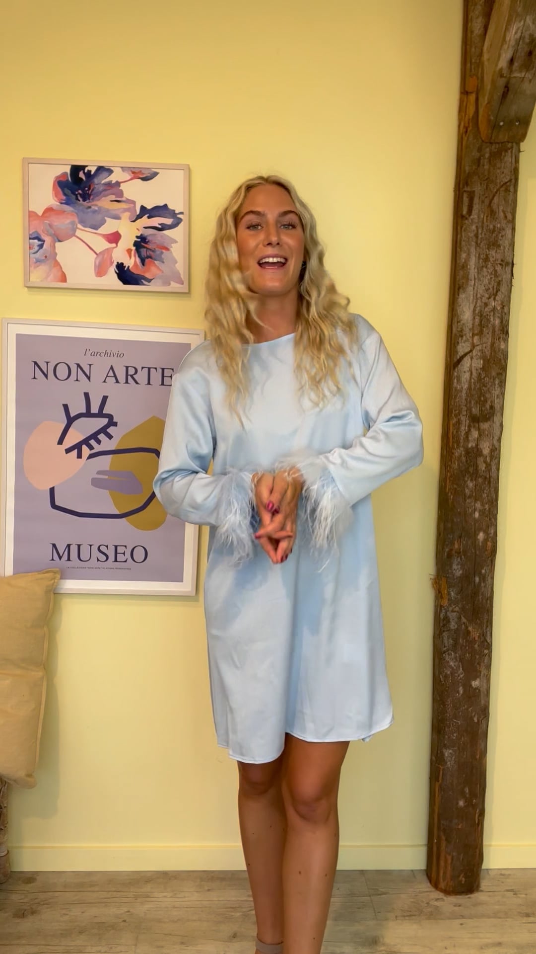 Virkelig smuk kjole fra A-View i en fin lyseblå farve. Kjolen er i et løst snit med fjerdetaljer både ved håndled og bund. Den har en diskret struktur i stoffet og super smuk at style med en stilet eller støvle alt efter anledning.