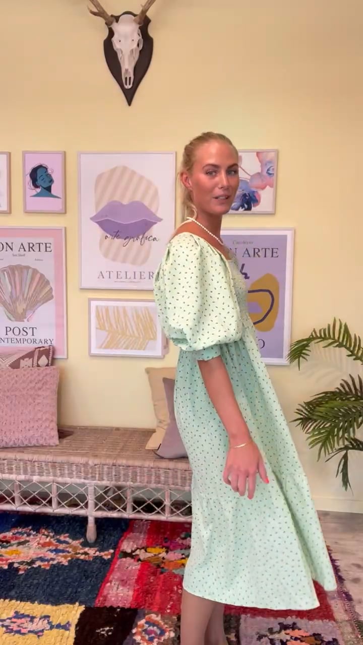 En rigtig sød sommerkjole fra A-View med grøn bundfarve og små blå kirsebær med grønne blade. Kjolen har en smuk længde med peplum forneden og smockdetalje ved barmen. Den har korte volumiøse pufærmer og er super sød både til hverdagen og sommerfesten.