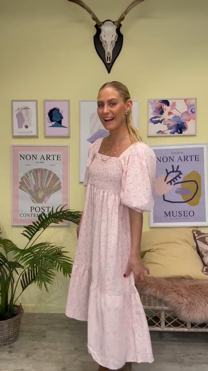 En af Lykke by Lykkes FAVORIT kjoler fra A-View er helt sikkert denne smukke model der findes i så mange skønne farver og prints. Denne sæson har de designet den med en rosa bundfarve og et helt fint lille grafisk mønster i beige og orange. Kjolen har smock ved brystet og volumiøse ærmer med elastik i kanten. Den er mellem lang med peplum i bunden og dejlig luftig at have på.