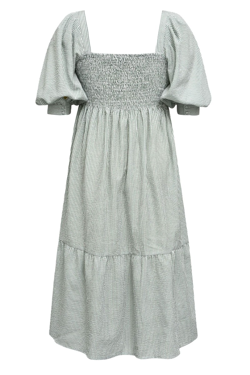 Fineste kjole fra A-View med smock ved brystet og pufærmer. Kjolen har en løst snit og er i en smuk grøn nuance - perfekt som sommerkjole.