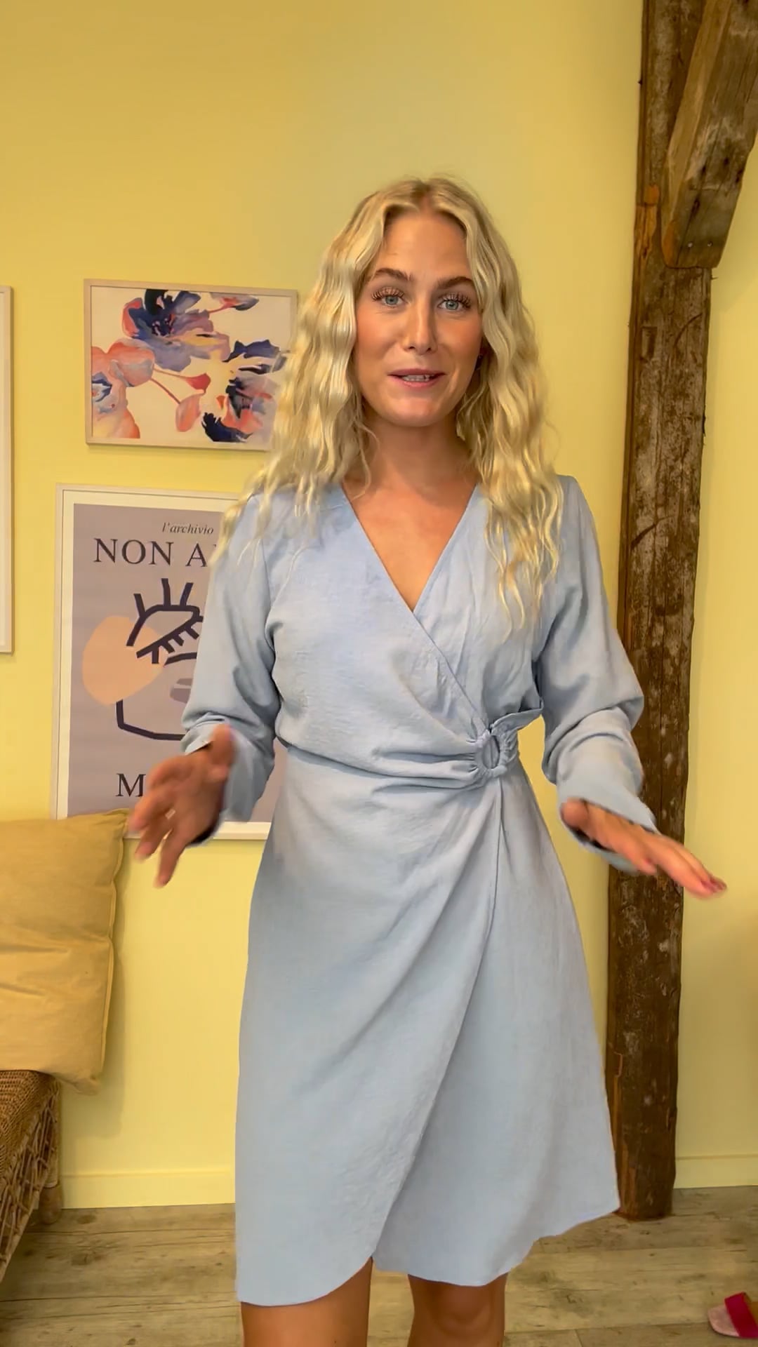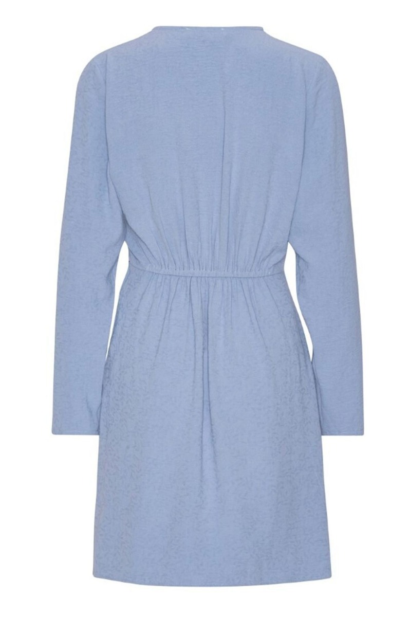 Smuk feminin enkel kjole fra A-View i en lyseæblå med struktur i stoffet. Kjolen har slå-om-effekt der sidder fast med en lille ring i siden og elastiksmock bagtil der giver den flotteste talje. Den er i et dejlig let og luftigt materiale med lange ærmer og en lille slids effekt foran. Style den både med stiletter til fest og samtidig brug den til festival med en cowboystøvle til.