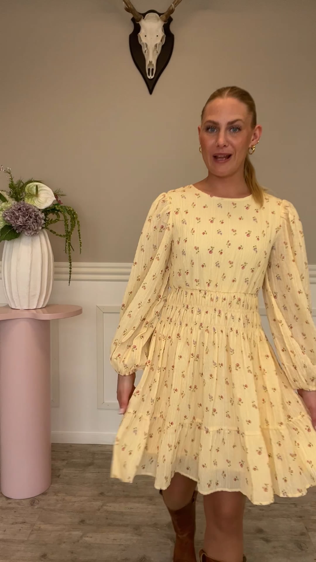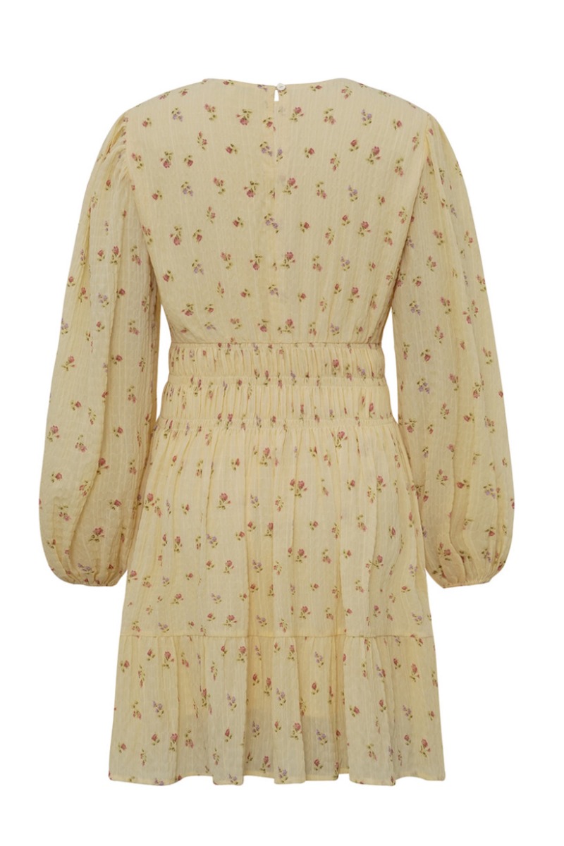 En smuk kjole fra A-View er kommet til denne sæson i denne smukke gule farve. Der er elastik i taljen og derfor kommer dette a snit i bunden. Deruodver lukkes den i nakken med en knap og har balloneffekt i ærmerne.