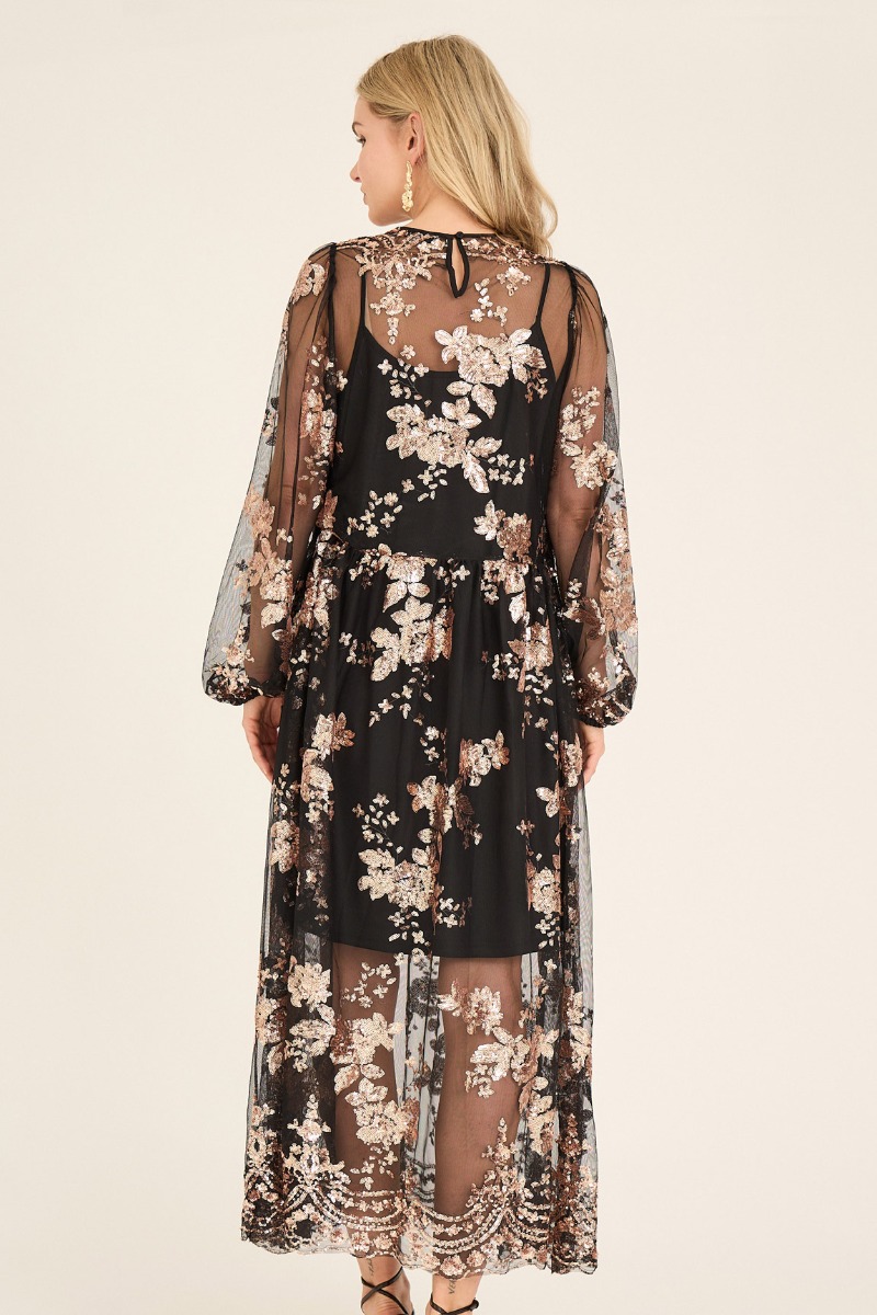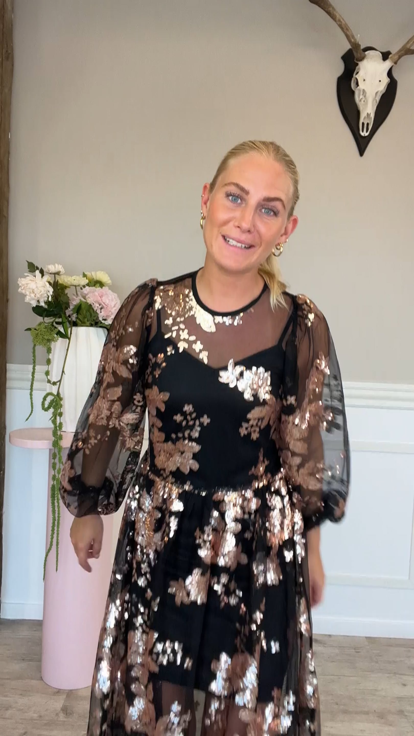 En superfin kjole fra A-View i sort mesh og med de flotteste blomsterformationer i rosegold. Denne kjole har lange ballonærmer og breder sig ud i et superflot skørt, som falder flot om benene. Style den til et par stiletter til fest!