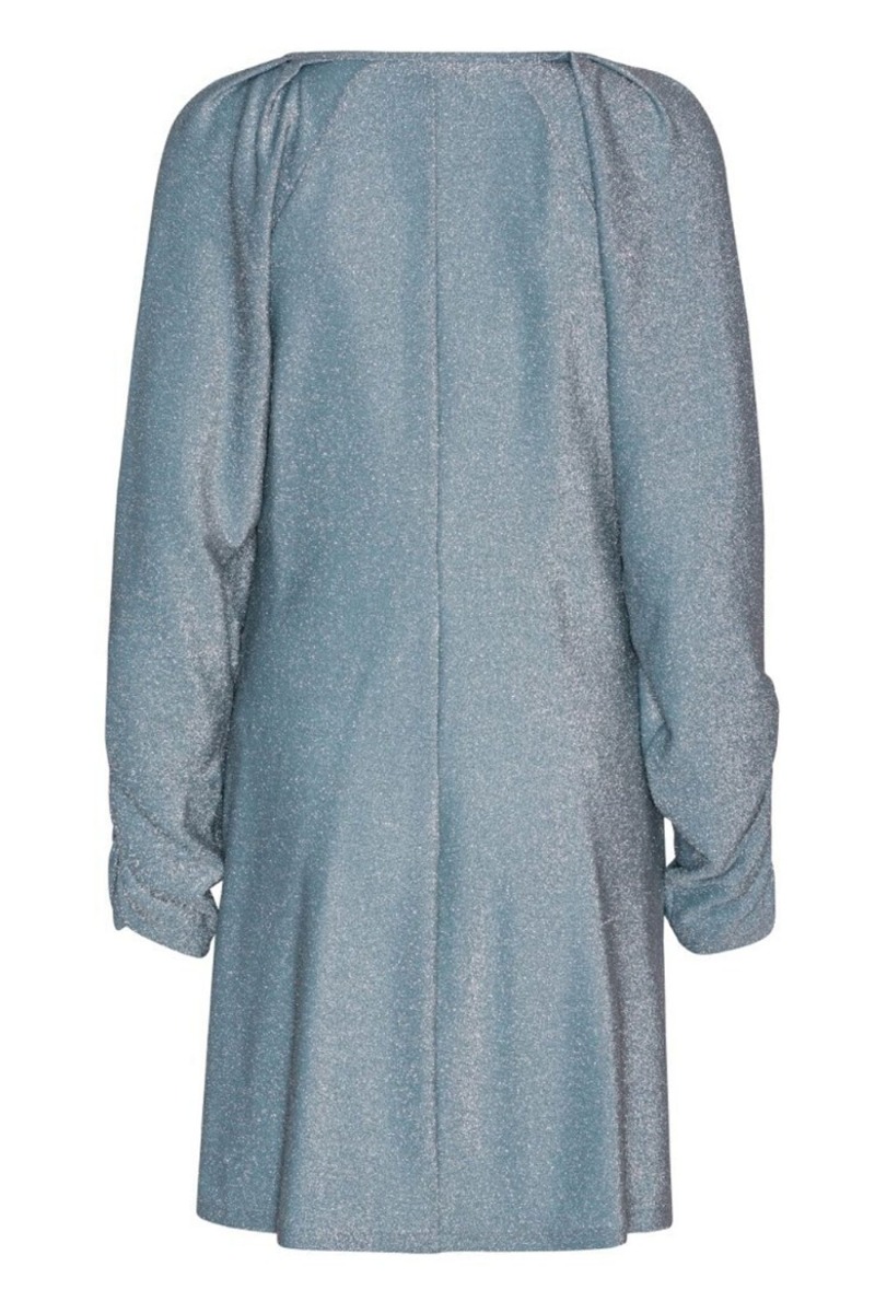Den lækreste kvalitet er denne kjole lavet i fra A-View. Det er med masser af stræk og har fin med glimmereffekt i sig. Glimmereffekt er en tynd tråd der er vævet ind i stoffet så det ikke drysser eller falder af i vask. Kjolen er med lange ærmer og har V hals samt en rynke detalje ved brystet. Den findes også i sort.