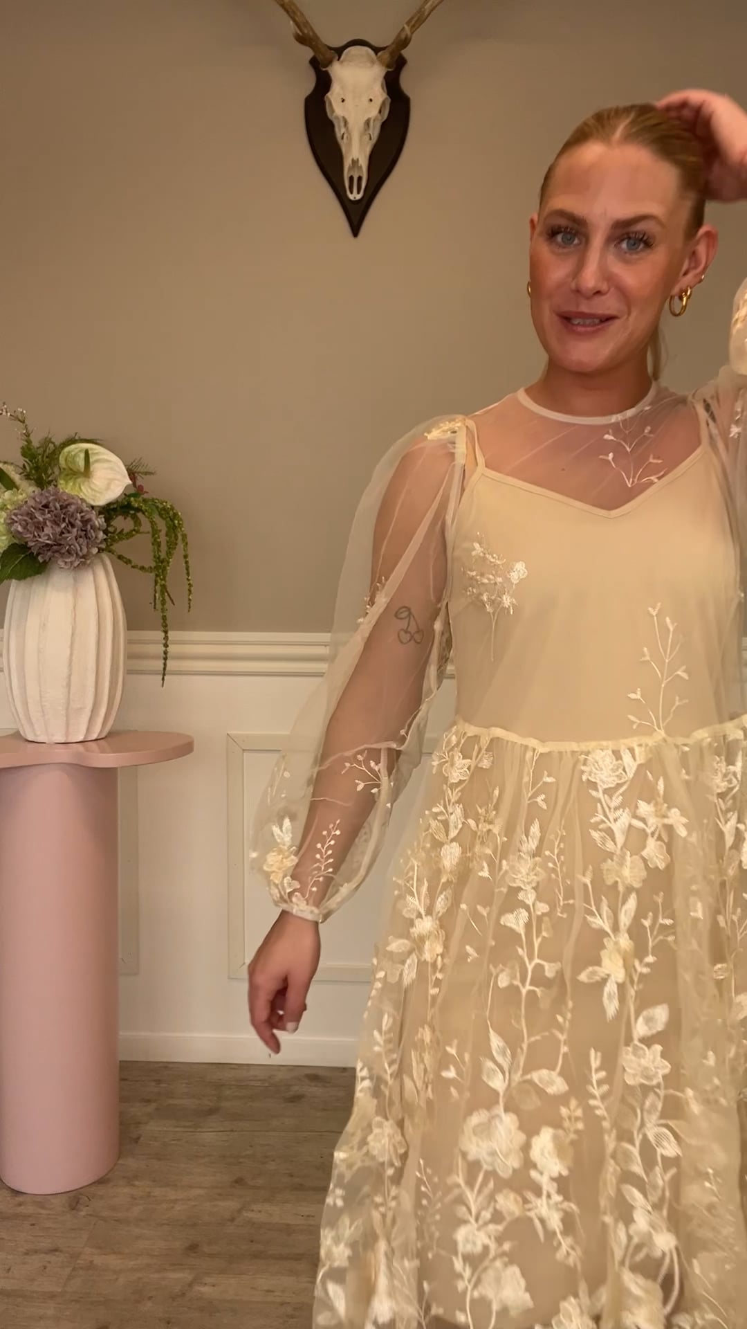 Denne lange, lysegule kjole har et drømmende og romantisk udtryk med sit lag af transparent mesh dekoreret med fine, broderede blomster. Underkjolen, som skal tilkøbes, er enkelt og glat, hvilket giver en smuk kontrast til det detaljerige ydre lag. Kjolen falder let og luftigt, og de lange, transparente ærmer tilføjer et elegant og eventyrligt præg. Det florlette materiale skaber bevægelse og gør kjolen ideel til sommerlige anledninger, fester eller som et feminint statement-piece. Det lyse, sarte farvevalg understreger det eksklusive og eteriske look.