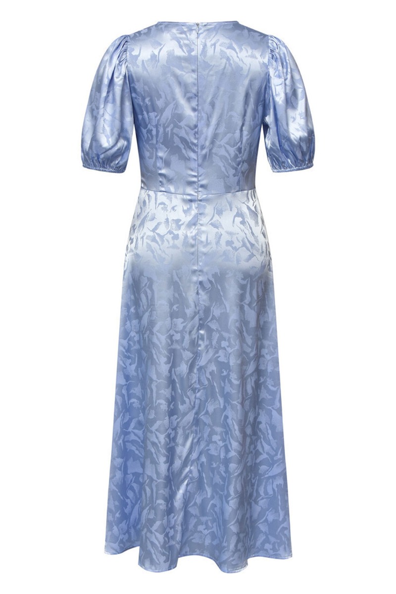 En VELKENDT model fra A-View er denne smukke sag der er kommet i den fineste lyseblå farve. Kjolen har et præget diskret mønster i stoffet og shineeffekt. Den falder utrolig smukt langs kroppen med en tydelig syning i livet der giver den flotteste taljen. Bagpå lukkes den med lynlås og har korte pufærmer. Style den til en slippers eller stilet.