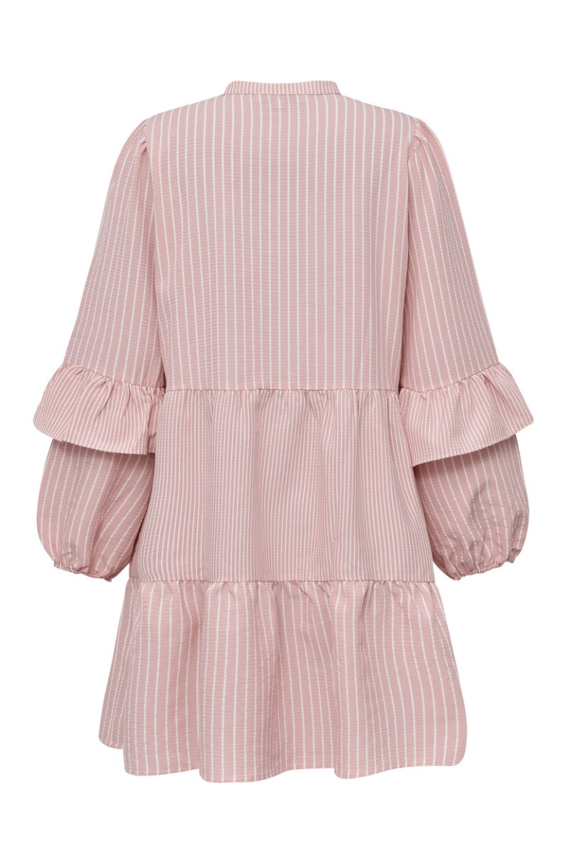En flot kjole fra A-View er landet i fine rosa og hvide striber. Den er med kinakrave og har et lille stykke med knapper ved brystet som fint indrammes med en flæsekant. Den har ballonærmer, hvor den samme flæsedetaljer er sat på. Den er løs i pasformen og findes også i en bluse model.