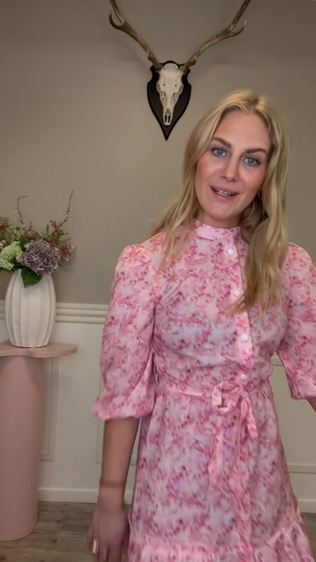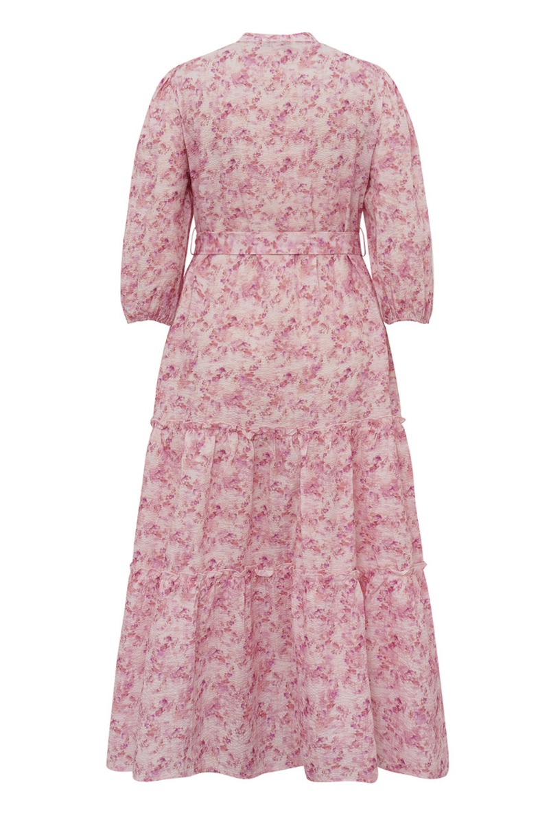 Denne kjole har et romantisk og feminint udtryk med et smukt mønster i rosa og lyserøde nuancer. Den er designet med knaplukning hele vejen ned og en elegant kinakrave, som giver et stilrent look. Kjolen har 3/4-lange ærmer med let volumen, der skaber en blød og behagelig silhuet. Det medfølgende bindebælte i taljen fremhæver figuren og giver mulighed for at tilpasse pasformen. Med sin lange længde og flæsedetaljer nederst er den perfekt til både hverdag og særlige anledninger.