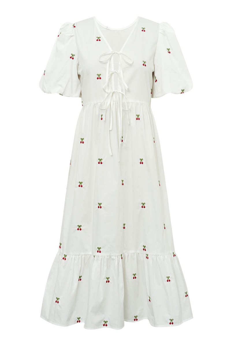 En fin kjole med smukke kirsebær broderet i stoffet og ellers en klassisk hvid farve. Den er med vide i bunden og med pufærmer som giver et smukt og let udtryk. Den er med sløjfer bagpå og kan vendes så sløjferne er foran.