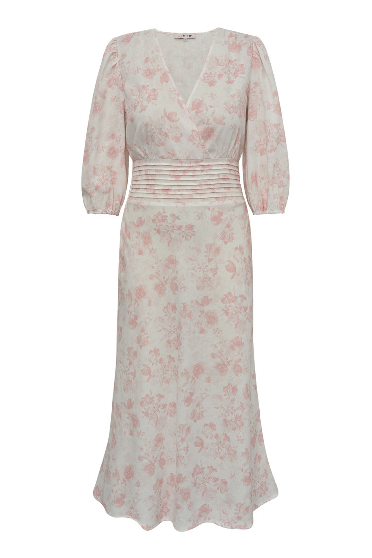 En utroligt smuk og elegeant sommerkjole fra A-View er landet. Denne kjole er luftig, syet ind i taljen med flotte detaljer og V-udskæring. Den er super oplagt til sommerfesten, og er også rigtig fin med en strik over!