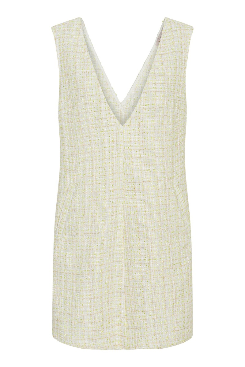 Den vildeste spencer til dato!! Nu kan du shoppe denne spencerkjole fra A-View i den blødeste vævet kvalitet. Det kan være svært at se på billedet, men der er små glimmereffekter i stoffet som giver den smukkeste effekt. Der er desuden vævet grønne tråde ind i som giver en skøn og frisk detalje til den ellers neutrale hvide farve. KÆMPE ANBEFALING HERFRA!