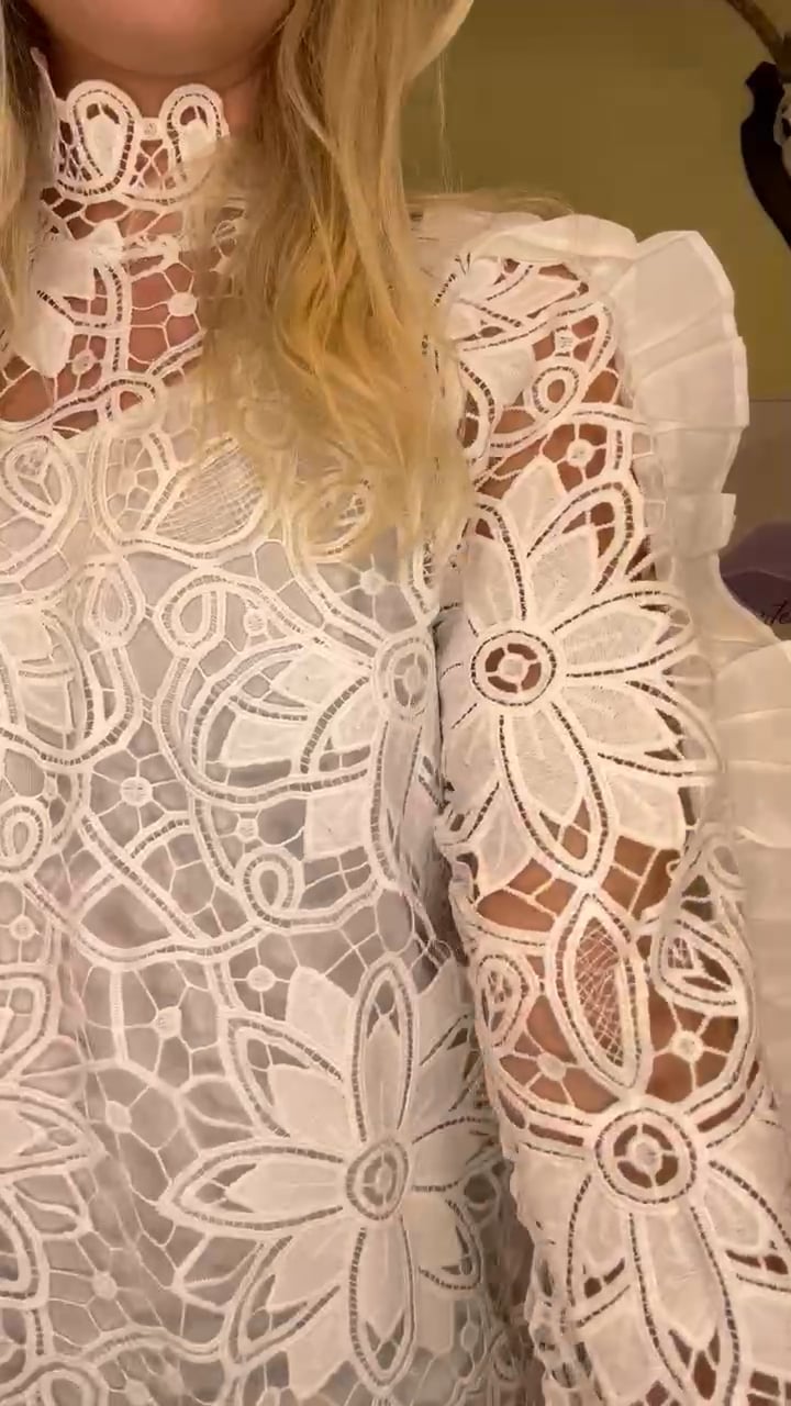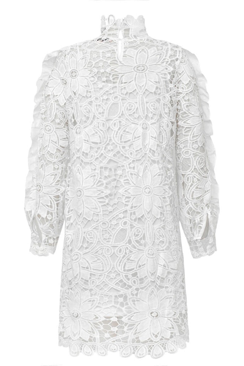 Kjolen er i en kort model med flæsedetaljer ved ærmet og høj blonde hals. Denne kjole er designet i den fineste blonde mønster der er hullet og med medfølgende underkjole i hvid. Den knappes i nakken med to knapper der giver en lille åbning bagtil. Style denne kjole med en flot enkel stilet eller cowboy støvle alt efter hvilket look du søger.