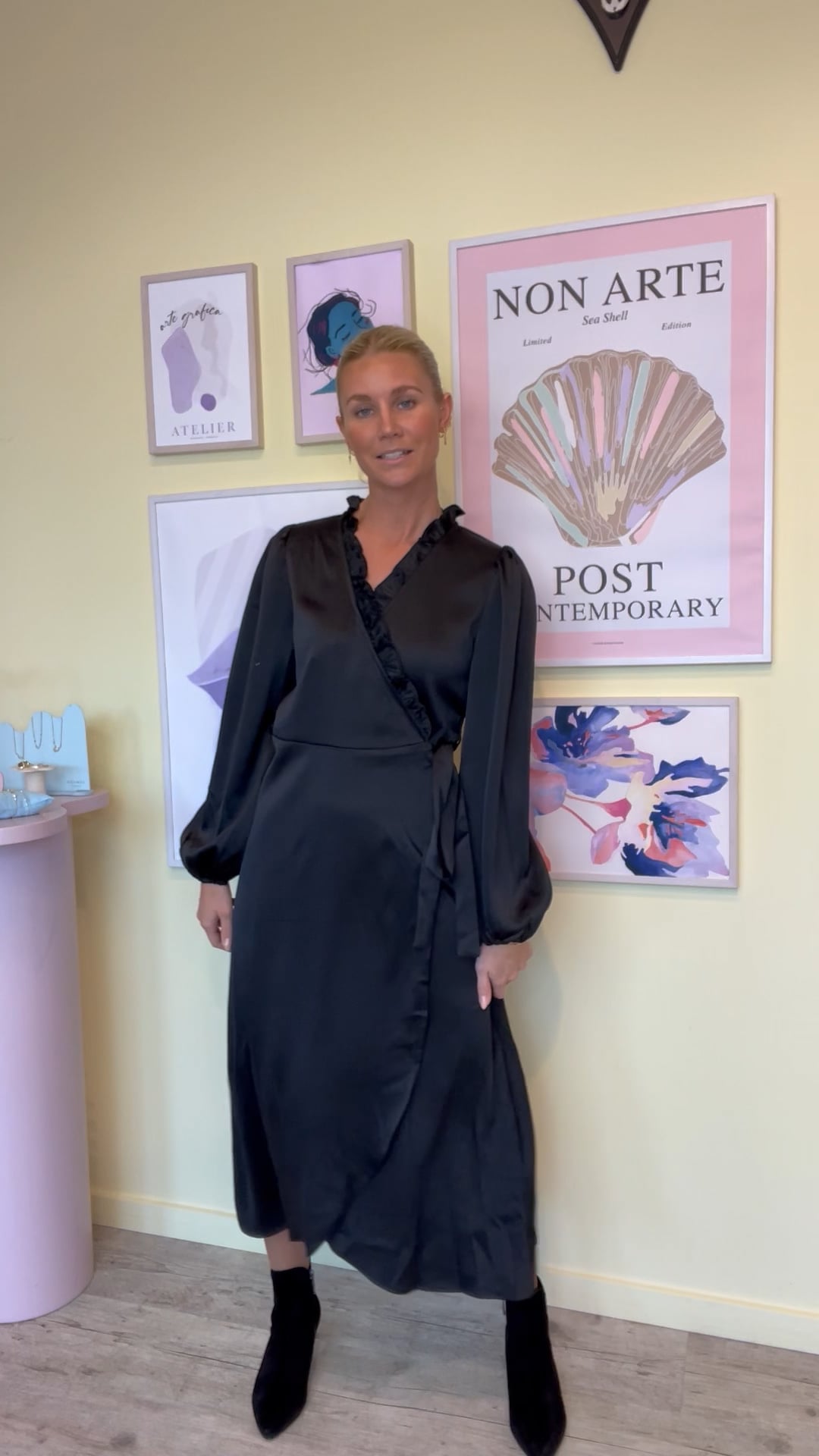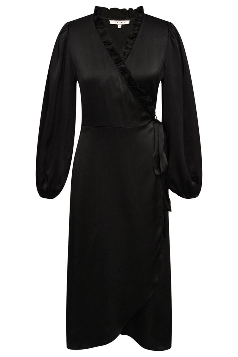 Denne kjole er fra A-View og er en kendt model. Nu er den bare kommet i sort og med lange ærmer. Det er en slå-om model som bindes i den ene side. Ærmerne afsluttes med en tynd elastikkant i bunden og brystets slå-om effekt markeres med en lille flæsekant.