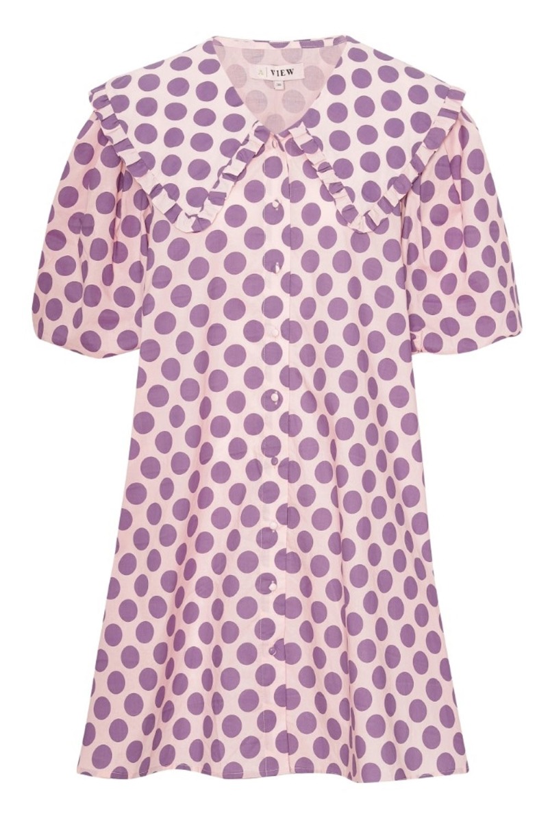 En kjole man kun kan blive glad af! Denne kjole fra A-View er rosa med store lilla prikker. Den er løstsiddende med korte ballonærmer og en bred krave. Foran lukkes den med knapper hele vejen ned og har medfølgende bindebånd i livet der giver en smuk talje. En kjole der både kan styles til hverdag og fest.