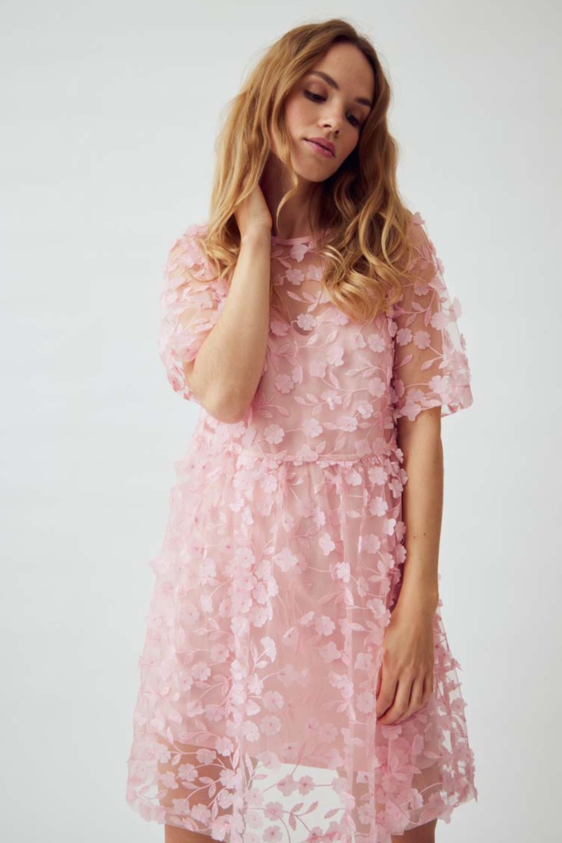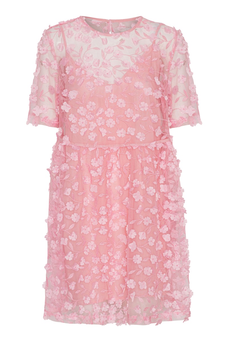 Smuk kjole med fine små blomster, der nærmest "popper" ud af kjolen og skaber en cool 3D-effekt, som vi virkelig kommer til at se meget til denne sæson. Kjolen er med underkjole og overdel i meshkvalitet.