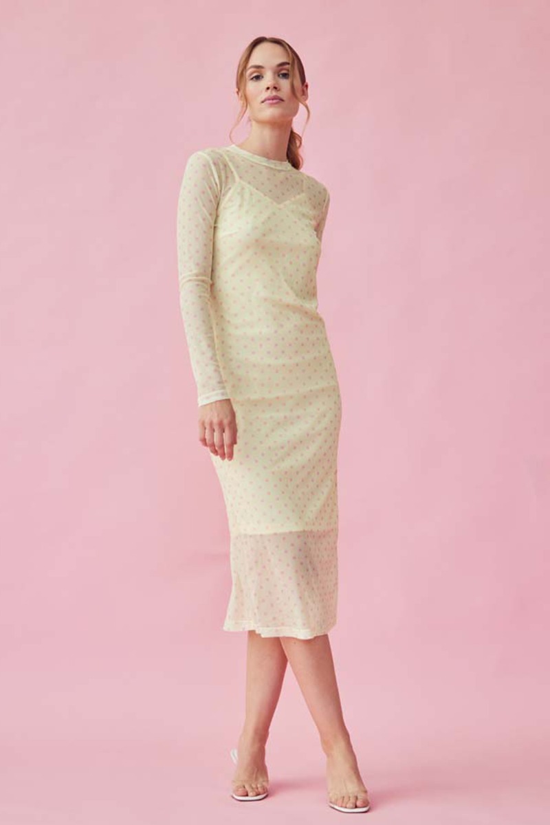 Tætsiddende meshkjole fra A-View i smuk lysegul farve med fine rosa prikker. Kjolen er i to lag, hvoraf det yderste lag er i en gennemsigtig meshkvalitet. Kjolen er med masser af stretch, så den er også helt perfekt til dig med babybule.