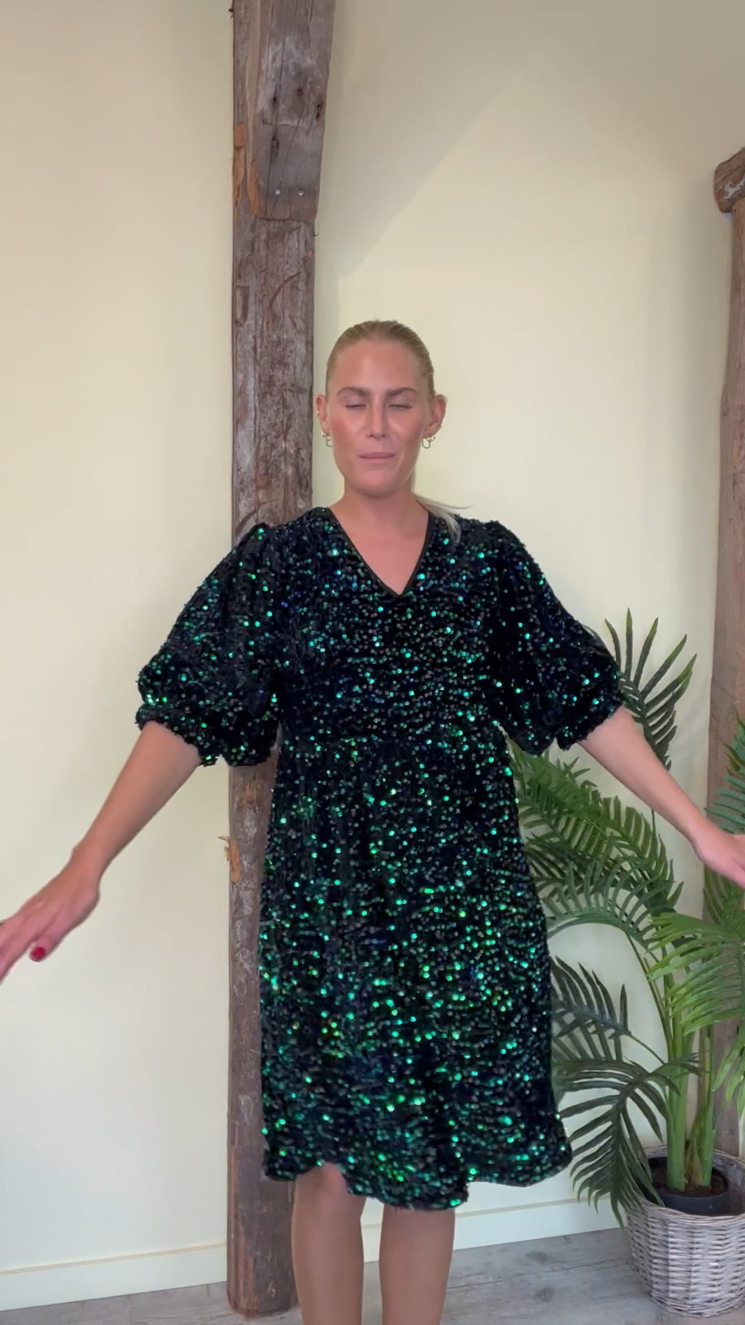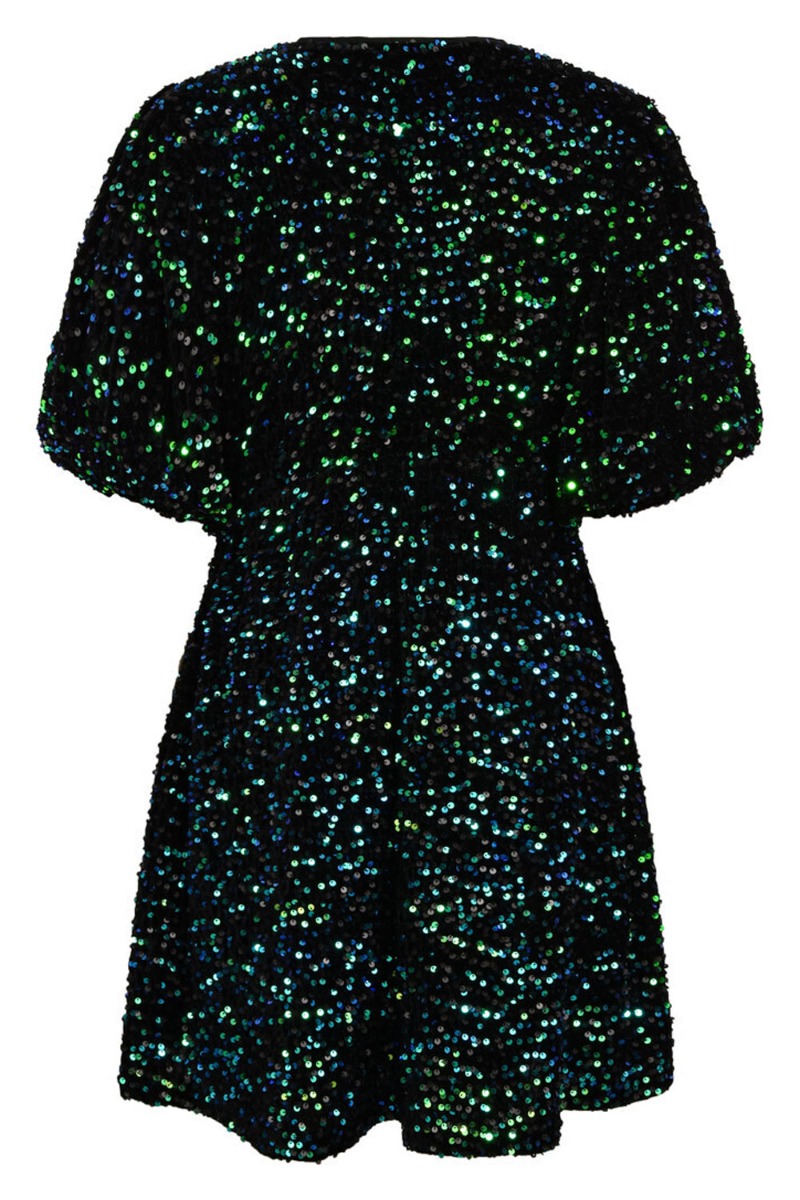 Den kjole er en løs pasformen og fra A-View. Den er fylt med pailetter i blå og grønne nuancer. Derudover er den foret med en fastsyet underkjole og fine pufærmer. Den er V halset samt tung i kvaliteten så den falder flot på kroppen. En rigtig julefrokost kjole!
