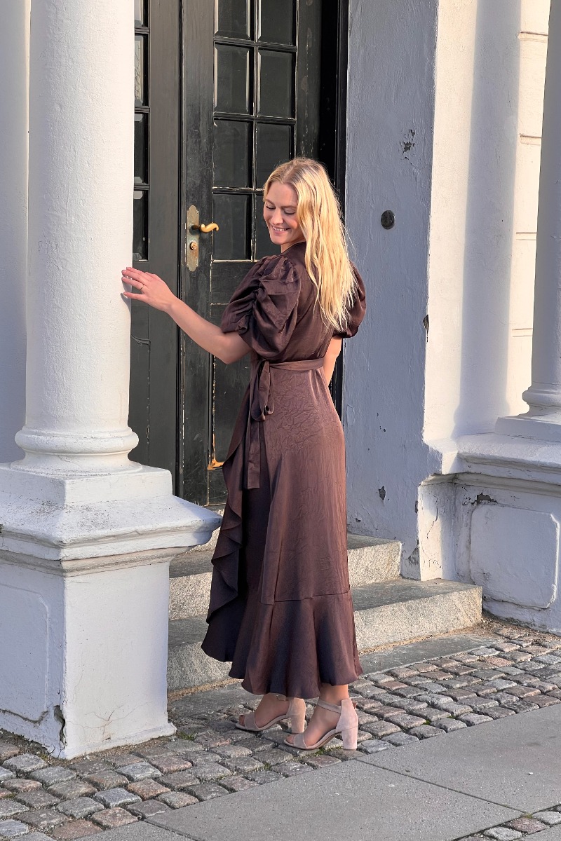 En elegant slå-om kjole model fra A-View i det skønneste satin look. Den er i en mørkebrun farve er altid god og passer til stortset alle. Den er med korte ærmer og sløjfen bindes i den ene side. Derfor er kjolen og ammevenlig og kan nemt bruges til den tidlige graviditet også. Den er med en flæsekant i bunden som giver dette feminine og lette udtryk til stylen. Brug den til hverdag med en sandal eller til fest med en fin stilet.