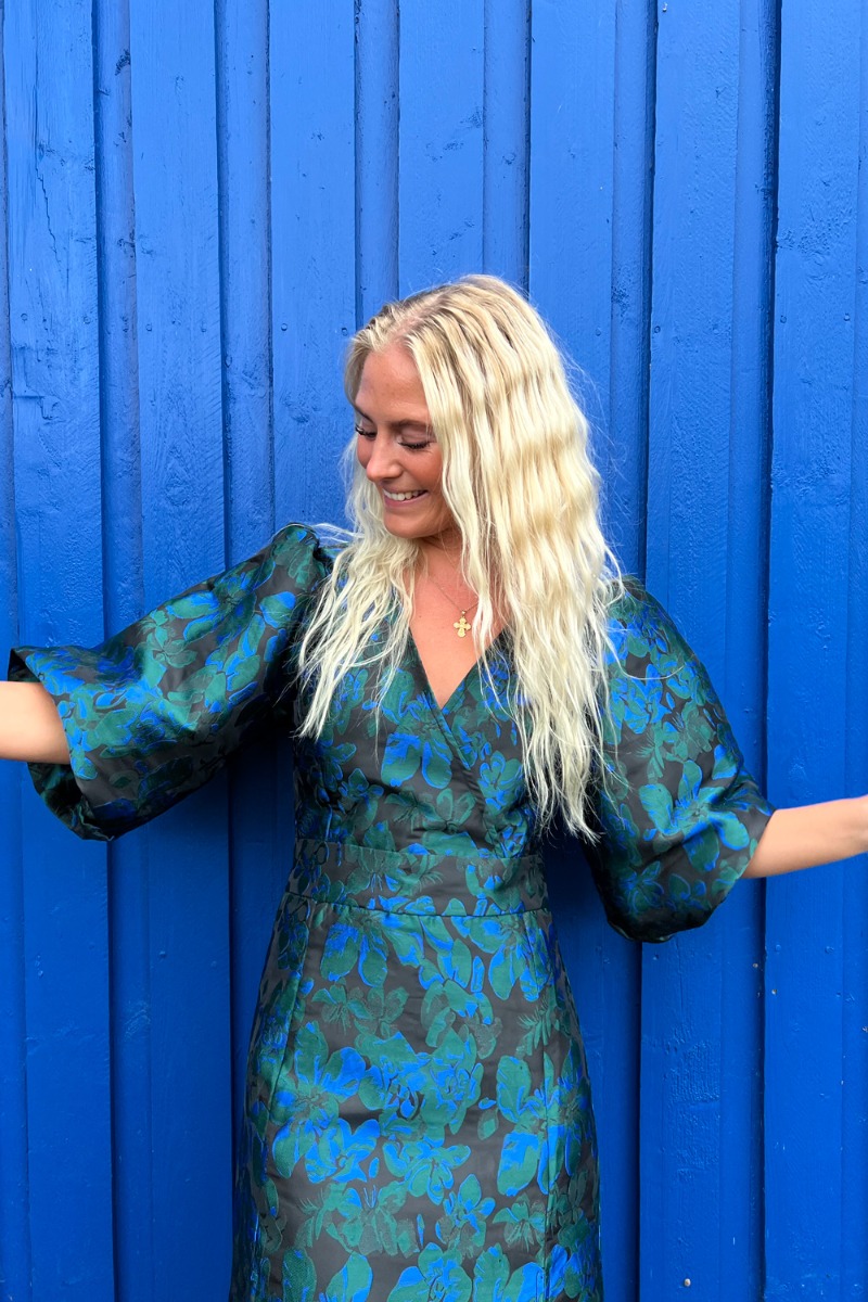 I kan allerede få fingerne i den VILDESTE celebration kollektion fra A-View. Denne smukke kjole sidder altså bare lige i skabet med dens tætsiddende pasform, god længde og det skønneste blå og grønne mønster. Den lukkes bagpå med lynlås og har volumiøse ærmer. Style kjolen med en grøn eller blå stilet.