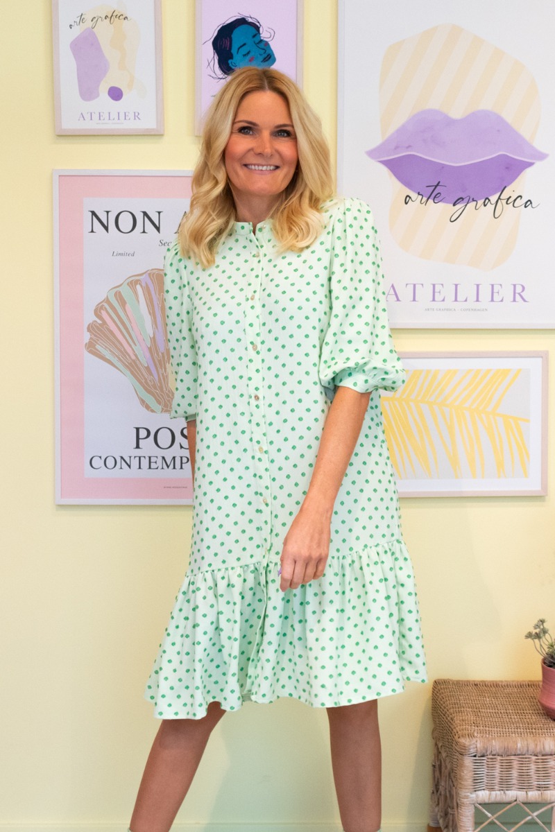 Den fineste kjole i lys grøn fra A-View kan nu blive din. Der er de fineste grønne dots som er gennemgående på hele kjolen. Der er desuden knapper hele vejen ned foran, som udover at give en sød effekt også gør kjolen ammevenlig. Der er kinakrave, som givet et enkelt og elegant look. Der er små ballonærmer og i det nederste stykke af kjolen er der en lille peplumeffekt.