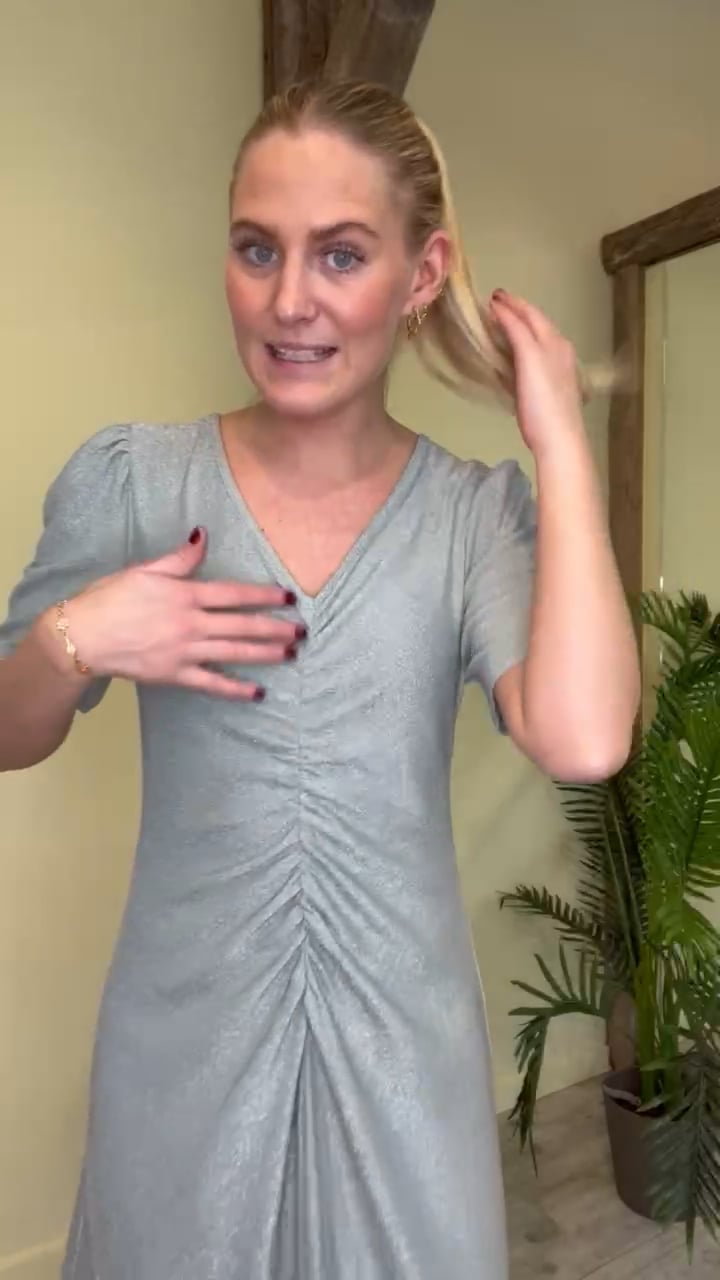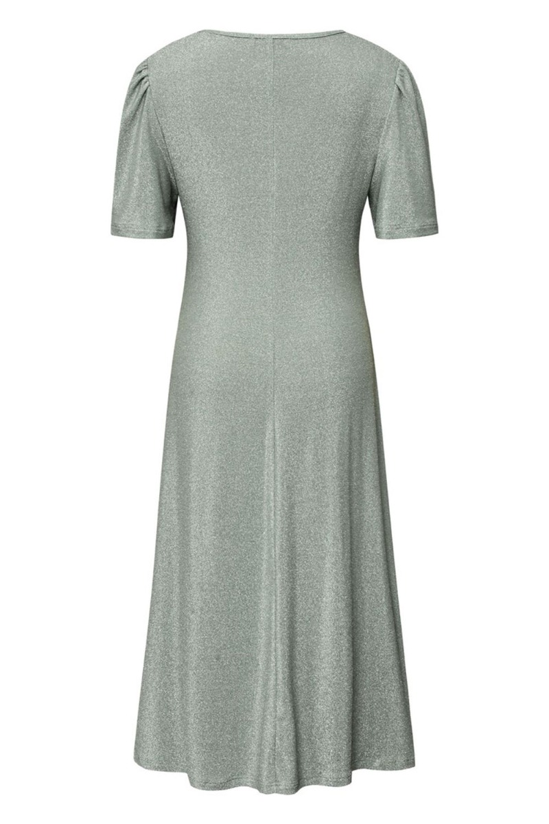 Den smukkeste kjole fra A-view med korte pufærmer og en v-udskæring ved halsen. Kjolen har fine drapperinger foran, hvilket gør at kjolen sidder så smukt på kroppen. Derudover er der en slids foran, som åbner kjolen en smule op. Den er lavet i en smuk glitrende kvalitet og er super behagelig at have på! En babybule er der også plads til i denne kjole. Style den med vores GENIALE club 15 strømpebukser, for et fuldendt look.