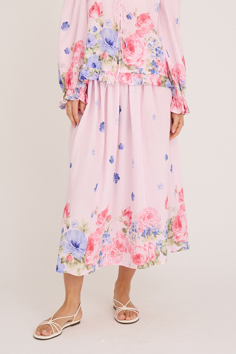 Nederdelen fra A-View har et let og romantisk udtryk i den lyserøde basefarve, der er dekoreret med små blå blomster spredt over stoffet. Langs kanten forneden samler et mere markant blomsterprint sig i smukke nuancer af rosa, blå og grøn, hvilket skaber en harmonisk og feminin afslutning. Materialet falder blødt og giver et luftigt, elegant look, som både kan styles afslappet med sandaler eller mere festligt sammen med en matchende bluse. Det samlede indtryk er let, sommerligt og fuld af farverig charme.