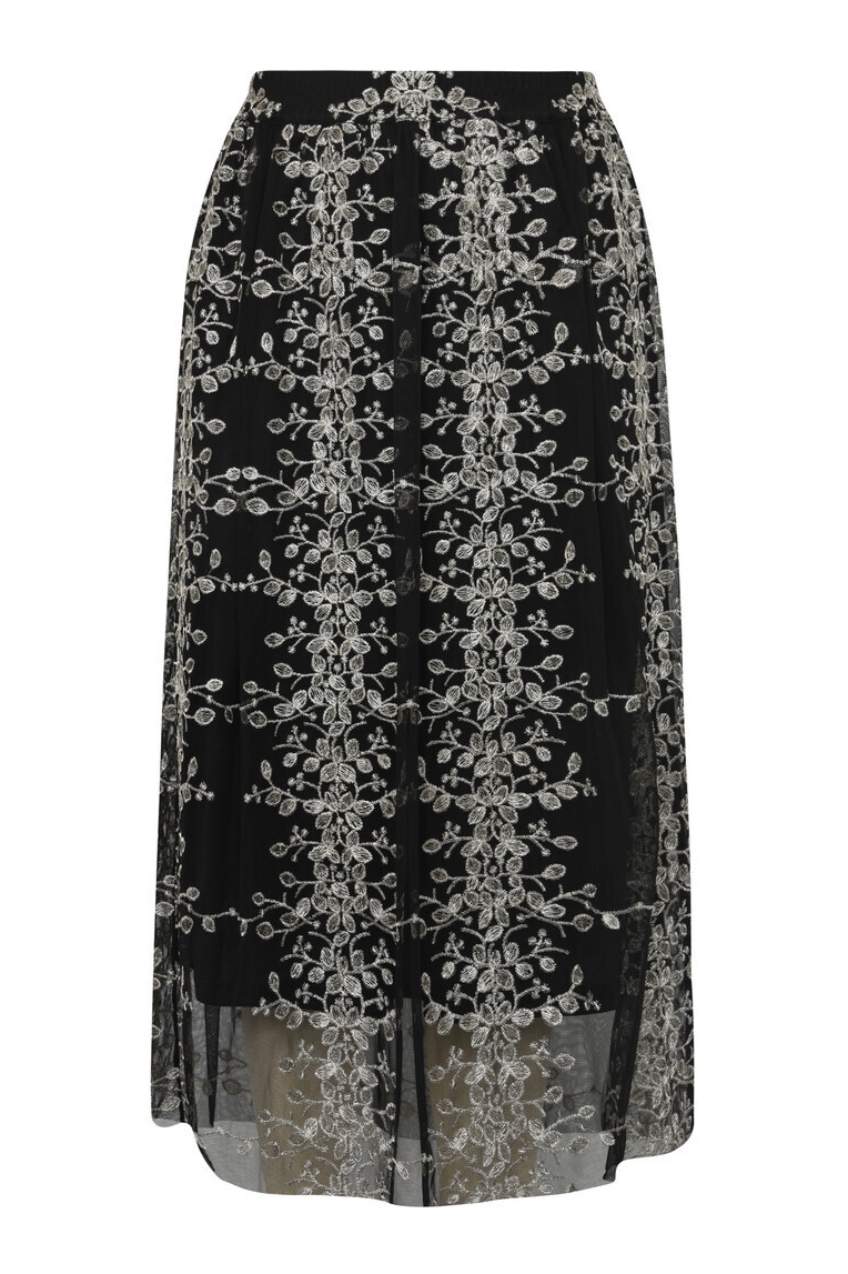 Nederdel fra A-View i et smukt design. Nederdelen er lavet i transparent sort mesh, med broderede detaljer i en metallisk farvenuance. Nederdelen har a-snit og elastik i taljen. Den er kun transparent i bunden.