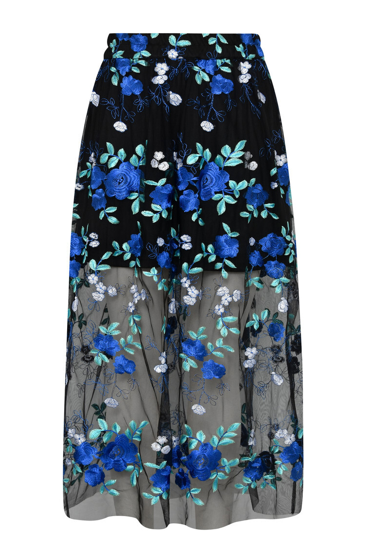 Den flotteste meshnederdel fra A-View! Denne nederdel har broderede detaljer i blå farvenuancer. Nederdelen har a-snit og elastik i taljen. Nederdelen er kun transparent i bunden.