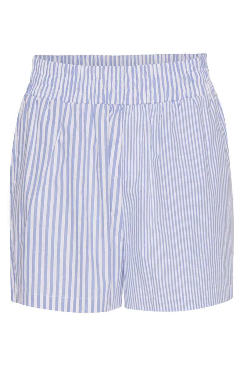 Blå stribet shorts fra A-View med den sødeste matchende skjorte i samme print. Shortsene er løse med en bred elastikkant og lommer. De er perfekte til de varme sommerdage og kan nemt styles helt afslappet med en t-shirt.