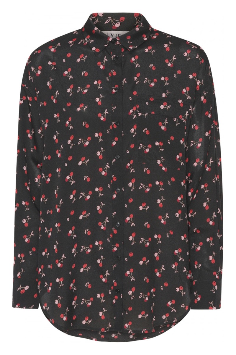Fineste kirsebærskjorte fra A-View. Bundfarven er sort og har matchende bukser i samme smukke print. Den er rummelig med sorte knapper foran og lange ærmer. Den er lavet i en let kvalitet og kan sagtens styles til jeans.