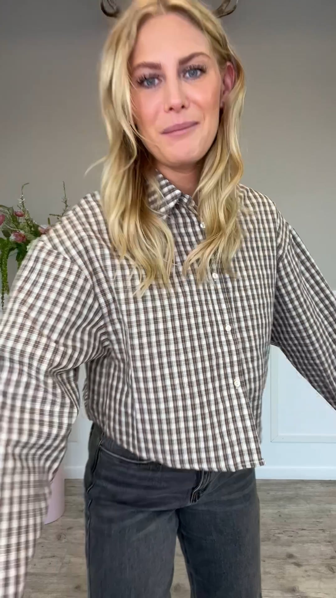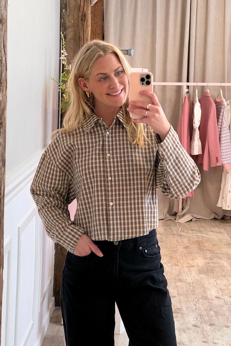 Skjorten har et klassisk ternet mønster i varme brun- og beige nuancer, som giver et roligt og tidløst udtryk. Den er designet med krave, gennemknapning og lange ærmer med manchet. Pasformen er let boxy og en anelse cropped, hvilket giver et moderne twist. Stoffet fremstår let og behageligt med et afslappet fald. Skjorten er nem at style både til bukser og nederdele for et casual, men stilrent look.