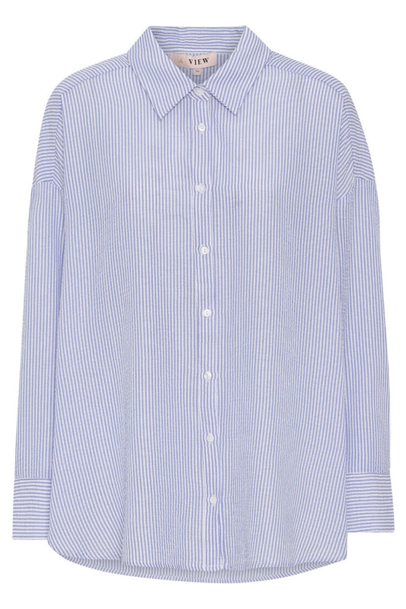 En nem og simpel skjorte er fra A-View og er med striber i hvid og i blå. Den er løs i pasformen og er med knaplukning samt klassisk skjortekrave. Derfor er den også ammevenlig og kan nemt styles til både jeans eller nederdel. Den findes også i flere farver.
