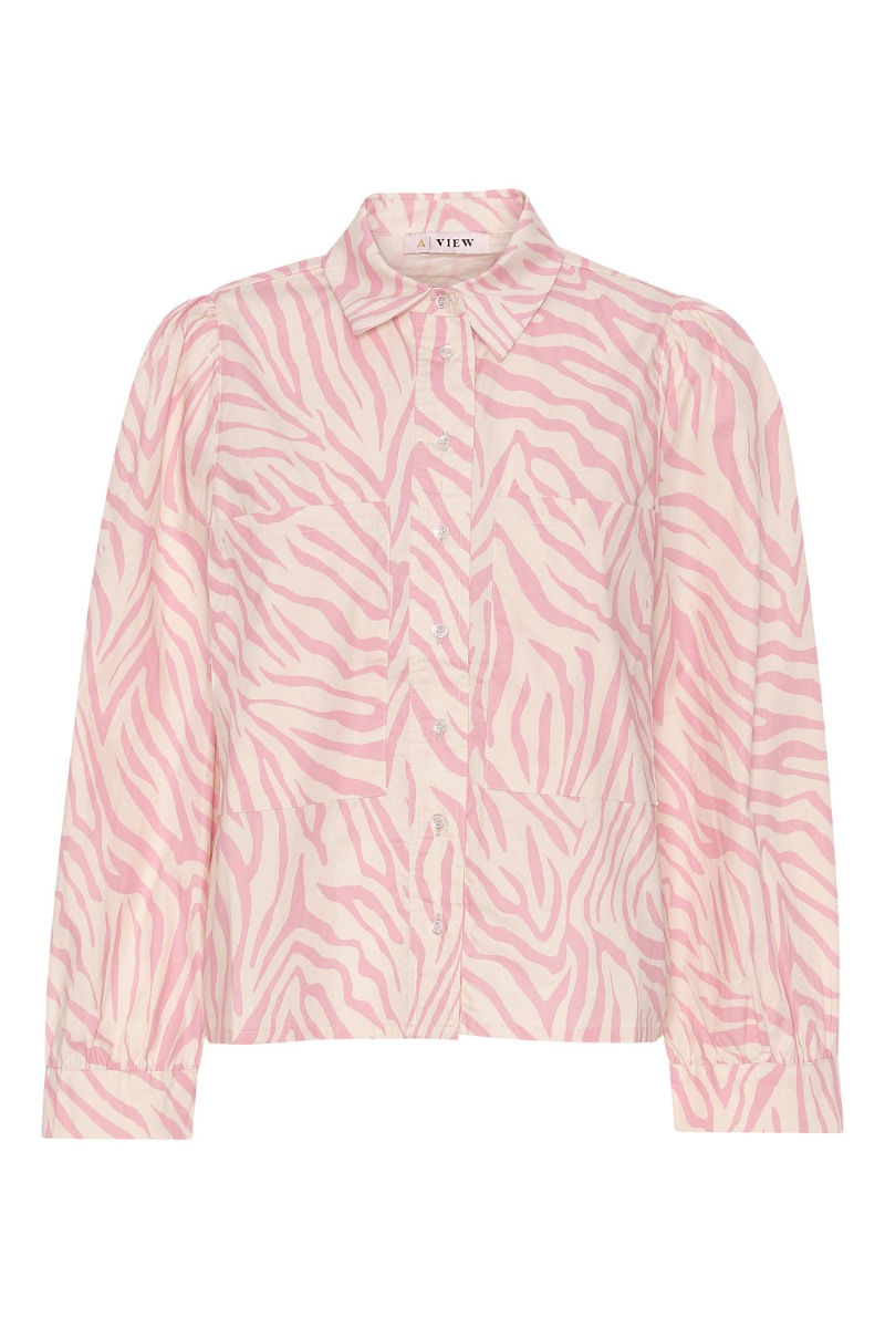 En sej kort a-formet skjorte fra A-View med lange brede ærmer. Skjorten er designet i et cool rosa zebra print med knapper foran, brystlommer og pufdetalje ved skulderen. Den er super cool at bruge til et par højtaljet bukser både til hverdag og fest.