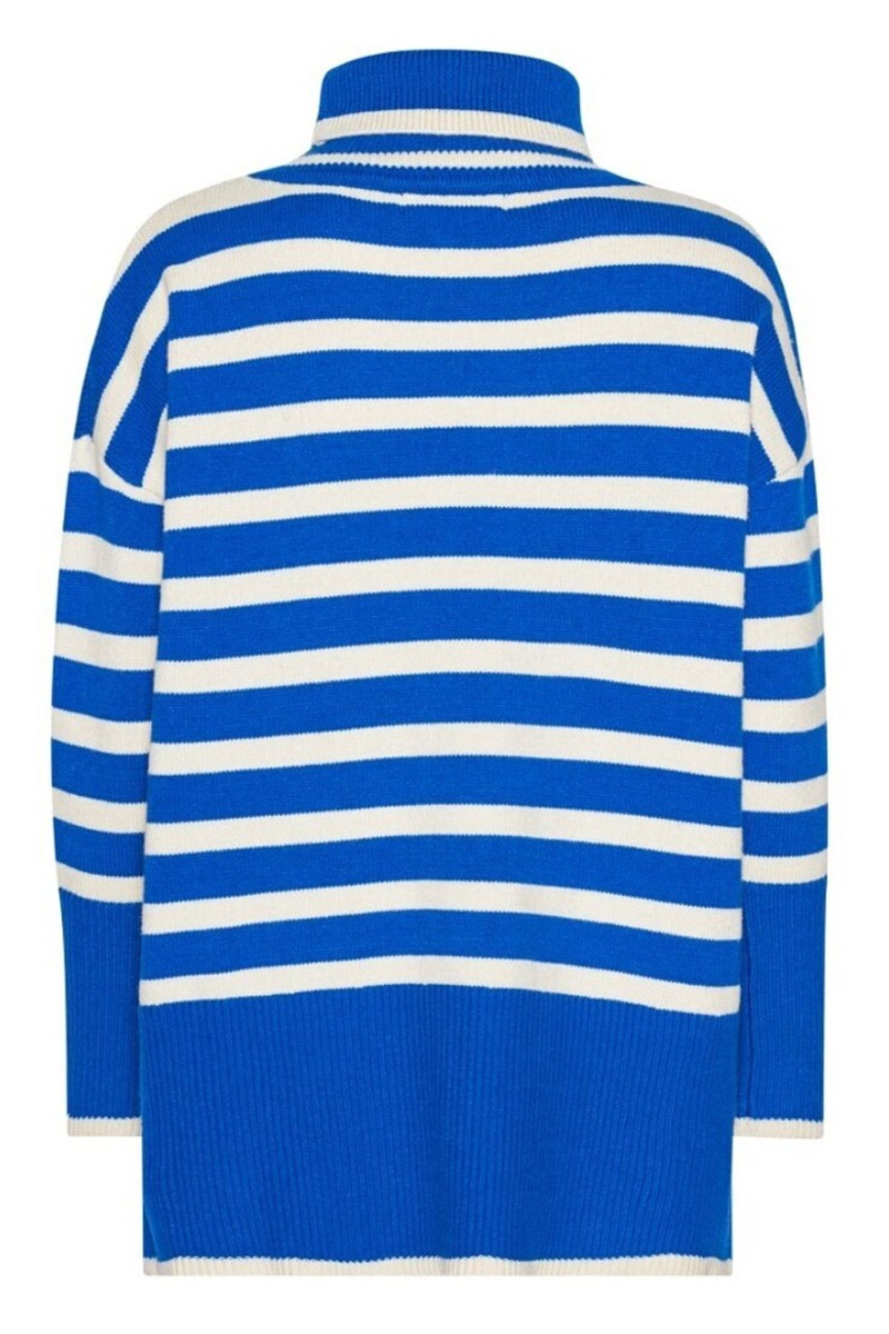 En dejlig blød strik fra A-View med vandrette striber i blå og beige. Strikken er med rullekrave som en bred ribkant ved både ærmer og bunden. I bunden er der også lavet en slids i begge sider. Derudover findes trikken i flere farver.
