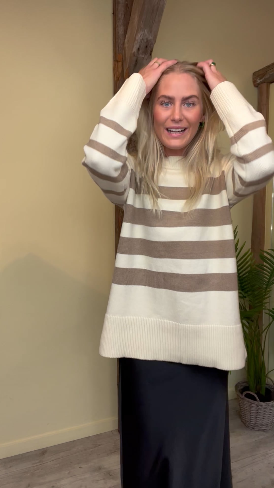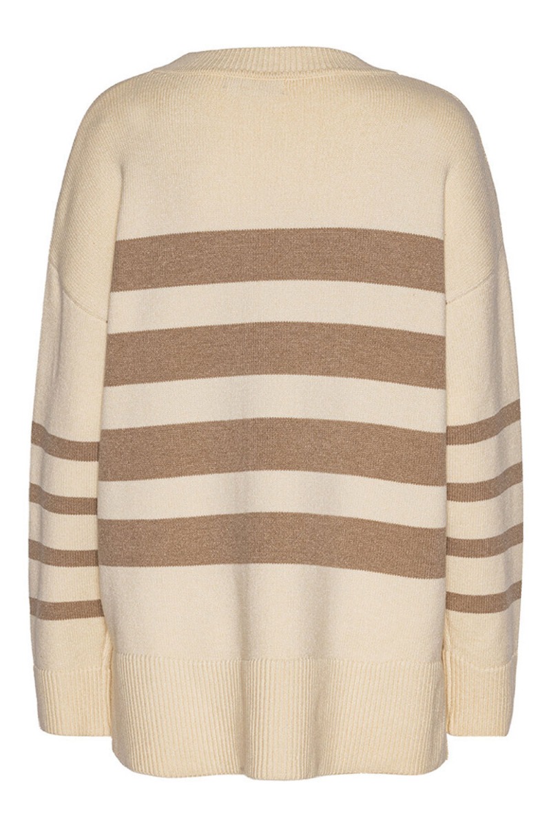 En dejlig blød strik er kommet fra A-View i beige nuacer. Den har vandrette striber henover brystet og findes også med sorte striber. Den er løs i pasformen og har ribkant ved aflsutningerne. Der er også en lille slids i begge sider i bunden, så den ikke strammer til her. Derudover er den fin sammen med en nederdel eller til et par jeans.