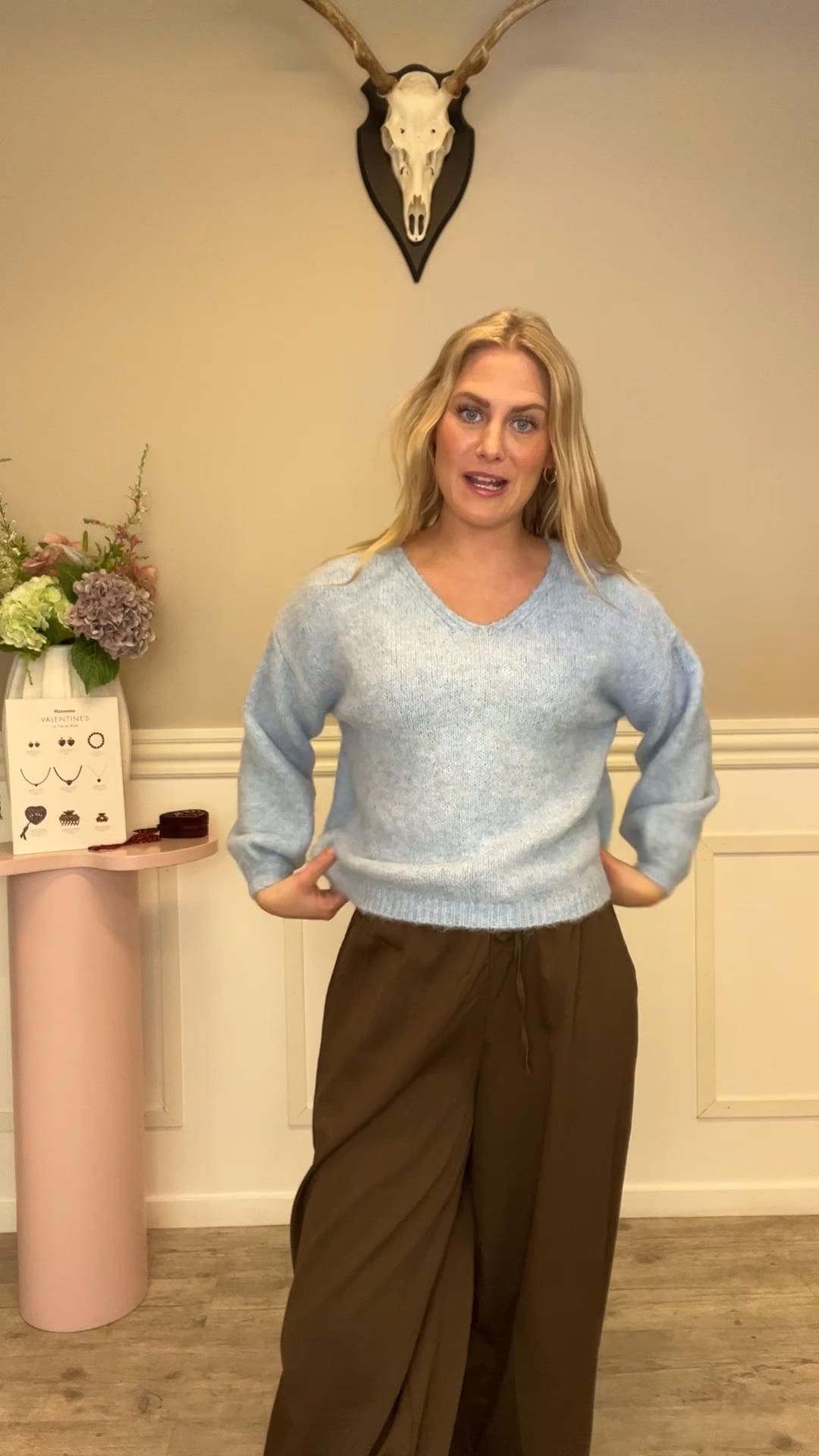 En fin strik fra A-View er kommet til denne sæson. Den er i den smukkeste lyseblå farve og har en smuk åben udskæring ved halsen. Den findes også i rosa og er i den blødeste kvalitet. Nem at style til hverdag med en nederdel eller jeans.