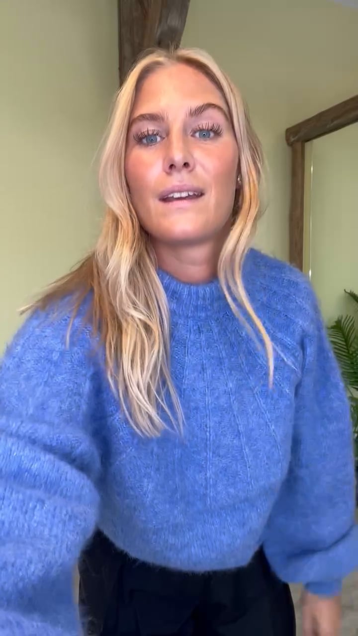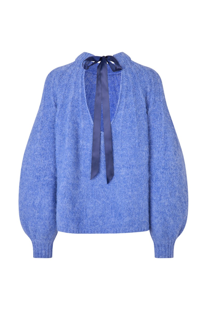 En super smuk strik fra A-View er landet i en flot blå farve. Denne strik har en udskæring i ryggen, som lukkes i nakken med et flot, mørkeblåt silkebånd - på den måde får du altså den flotteste sløjfedetalje. Strikken har flotte ballonærmer og en løs pasform.