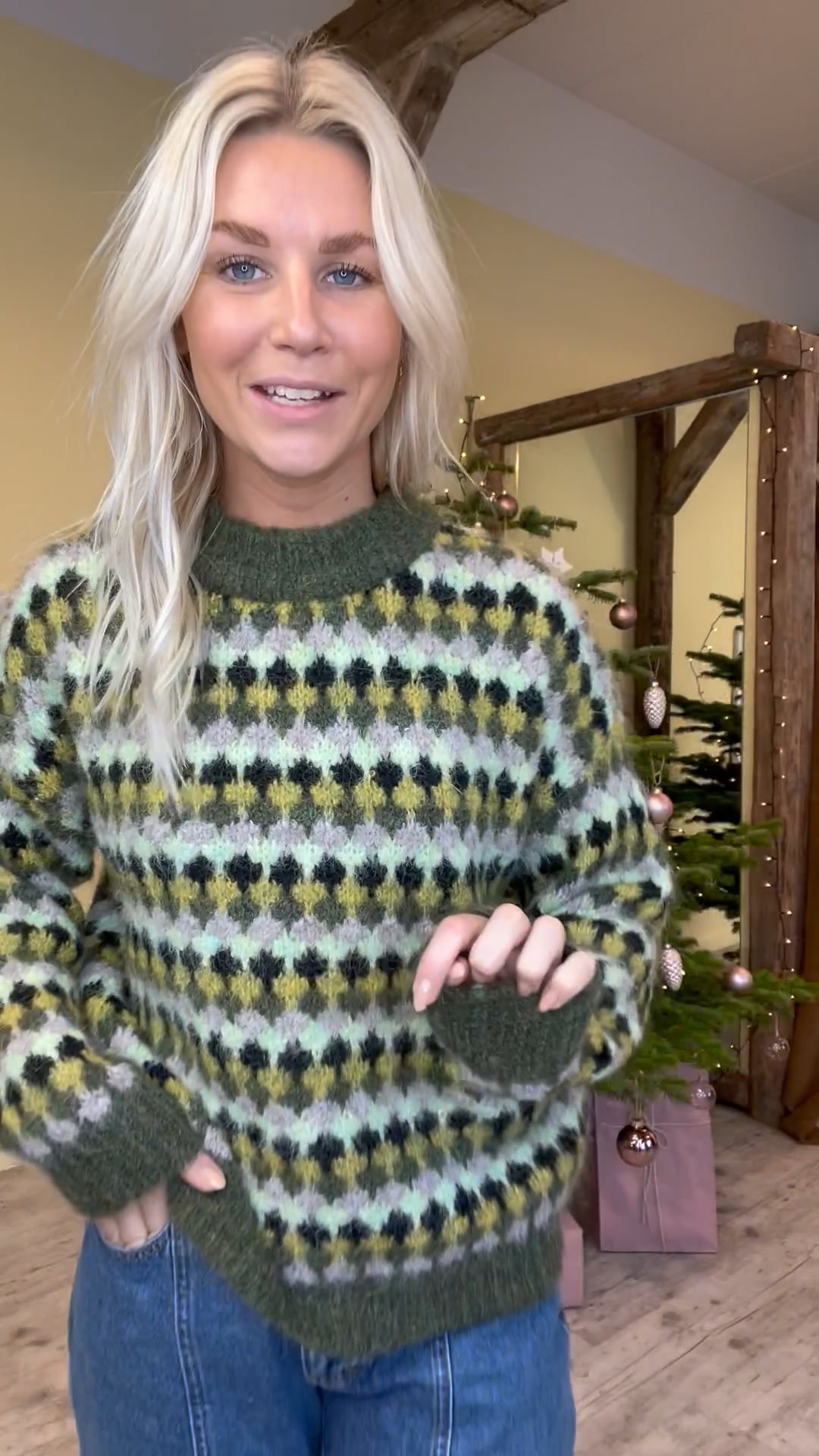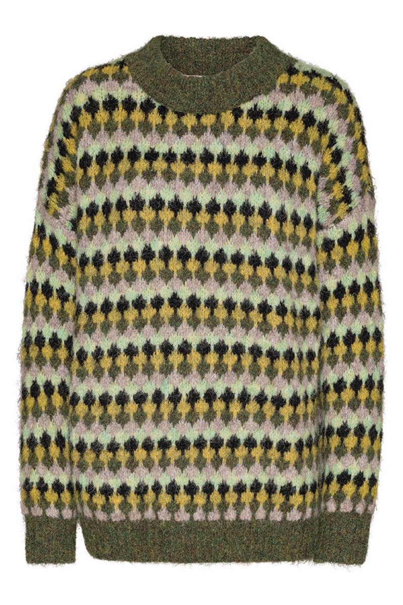 A-View har lavet endnu en fin strik i den blødeste kvalitet og i en helt perfekt pasform. Den er nedlig dejlig løs og den føles ikke tung at ahve på. Derudover afsluttes den med ribkant og har et ternet mønster i grønne nuancer. Den er perfekt til denne årstid og findes i flere farver.