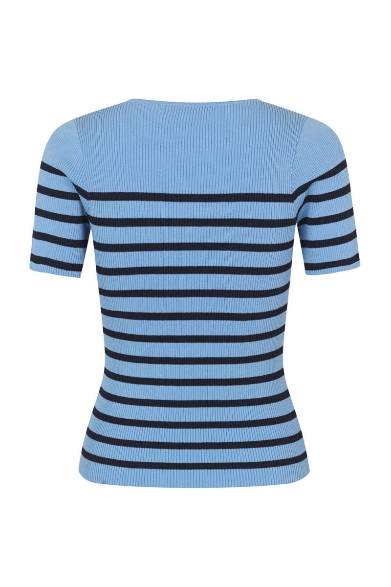 Skøn T-shirt fra A-view. Toppen er i den lækreste ribkvalitet! Den er blå med mørkeblå striber og med rund hals. Den er normal i størrelsen og er tætsiddende.