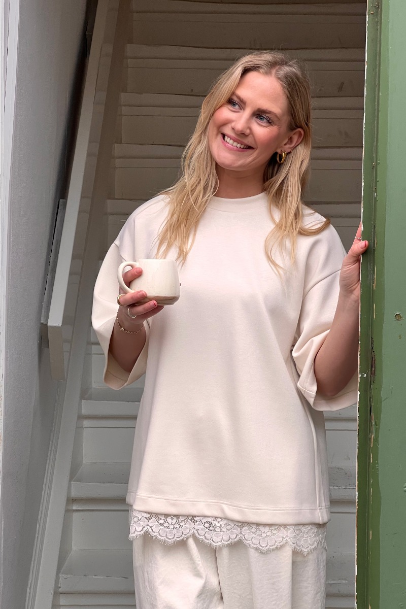 Denne oversize top har et enkelt og stilrent udtryk med en afslappet pasform og korte, brede ærmer. Den bløde kvalitet falder flot og giver et moderne look med masser af komfort. Den fine blondedetalje nederst tilføjer et feminint touch og gør toppen ekstra elegant. Perfekt at style med både jeans, bukser eller nederdel til hverdag og mere festlige anledninger. Et tidløst item, du nemt kan bruge sæson efter sæson.