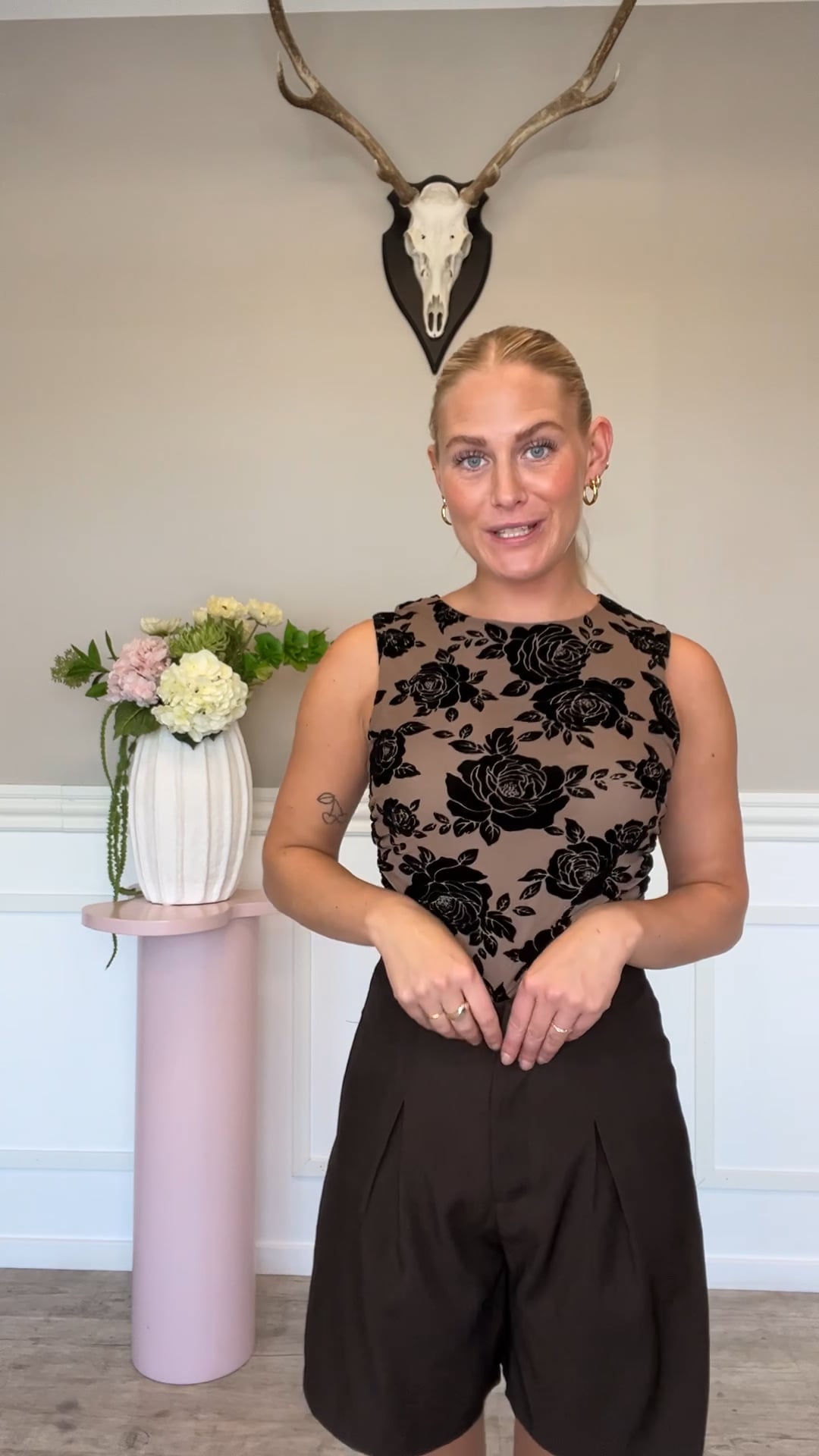 En fin top fra A-View er kommet i brun med blomsterprint i sort. Den er elegant i sit snit og perfekt sammen med den matchende nederdel som er nem at bruge til både hverdag og fest. Hele sættet findes også i sort.