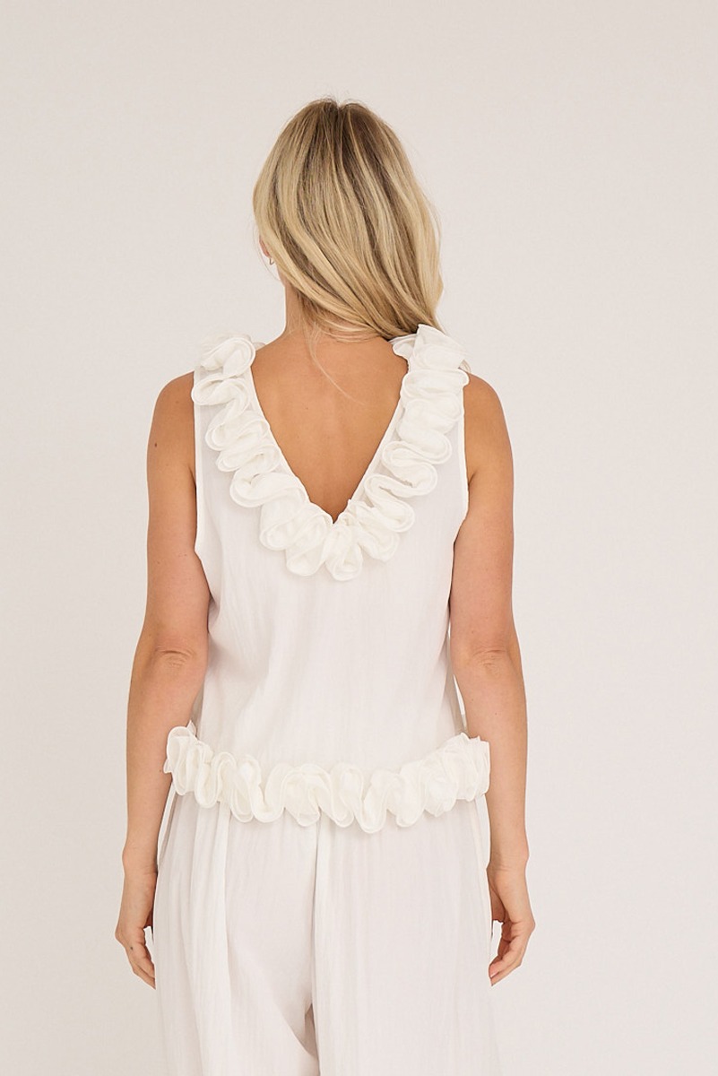 Toppen på billedet er en ærmeløs, let og luftig model i hvid, som har et meget karakteristisk design med dekorative, bløde stofvolanter både omkring halsudskæringen og i taljen. De runde, blomsterlignende volanter giver et feminint og romantisk udtryk og tilfører et særligt, håndlavet look til stykket.