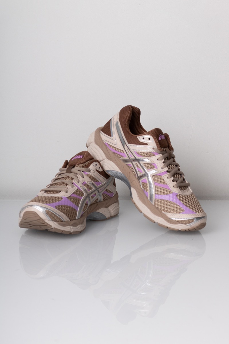 Skoene er et par sporty sneakers med et teknisk og moderne udtryk. De er designet i en kombination af mesh og syntetiske materialer, hvilket giver et let og åndbart look. Farvepaletten består primært af beige og brunlige nuancer, suppleret af detaljer i lilla og sølv, som giver et frisk og dynamisk præg. Overdelen har lagdelte paneler og snørelukning, der sikrer god støtte og en justerbar pasform. Sålen er kraftig og let buet med synlig støddæmpning, hvilket giver både komfort og stabilitet. Et par sneakers, der kombinerer funktionelt design med et trendy, sporty udtryk.