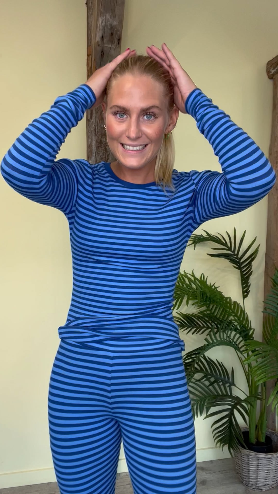 En fin bluse fra Basic Apparel er landet med striber i blå nuancer. Den er i en dejlig behagelig rib kvalitet og kan bruges til hvilken som helst underdel. Der findes også i et par matchende leggings til. Den findes også i flere farver.