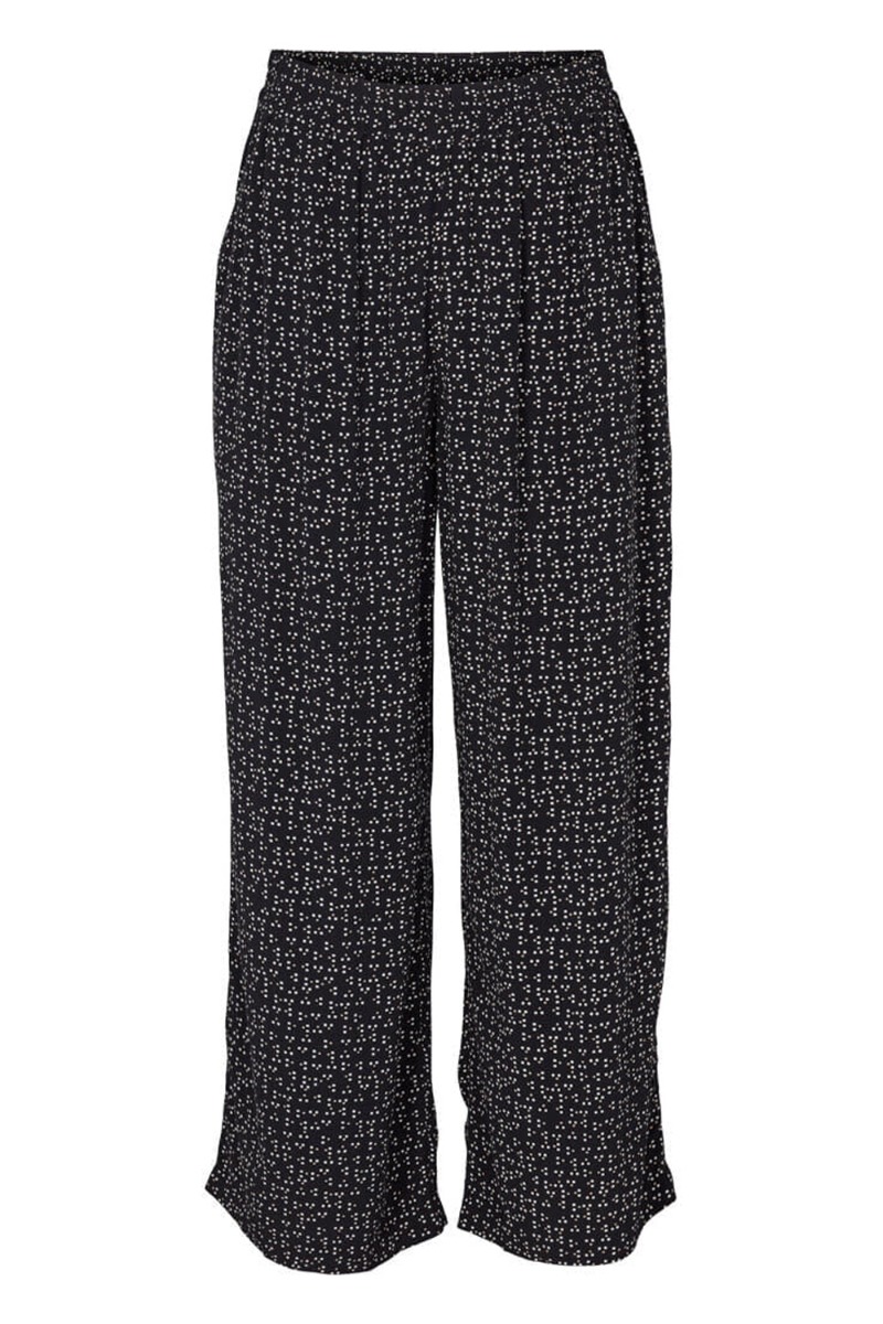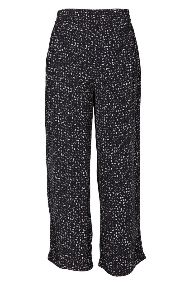 Basic Apparel har lavet det fineste feminine sæt som kan bruges til enhver anledning og det er virkelig det vi ELSKER Basic Apparel for! Disse bukser er lavet i en let behagelig kvalitet med en bred elastikkant ved taljen. De har vidde i benene med sort baggrund og små brune prikker. Style med den matchende bluse.