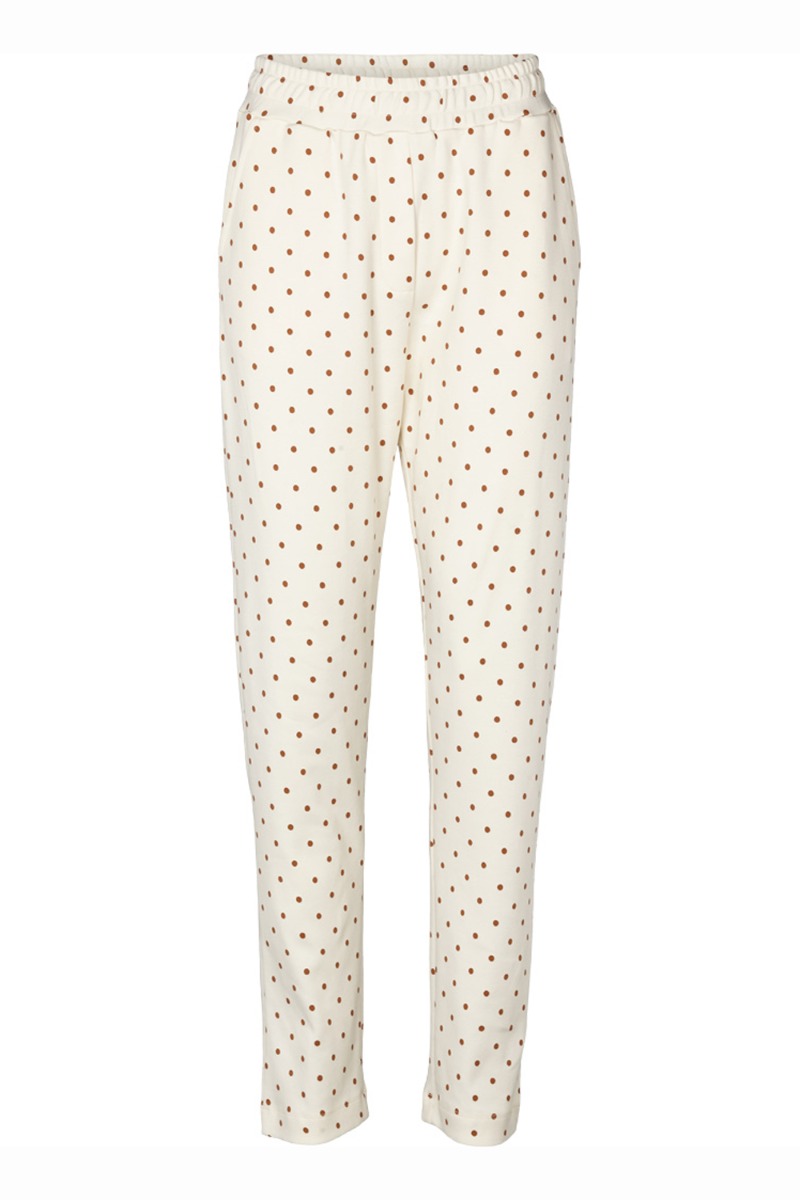 Basic Apparel bukser i lækker jerseykvalitet. Bukserne er i en flot råhvid farve med små kobberfarvede prikker.