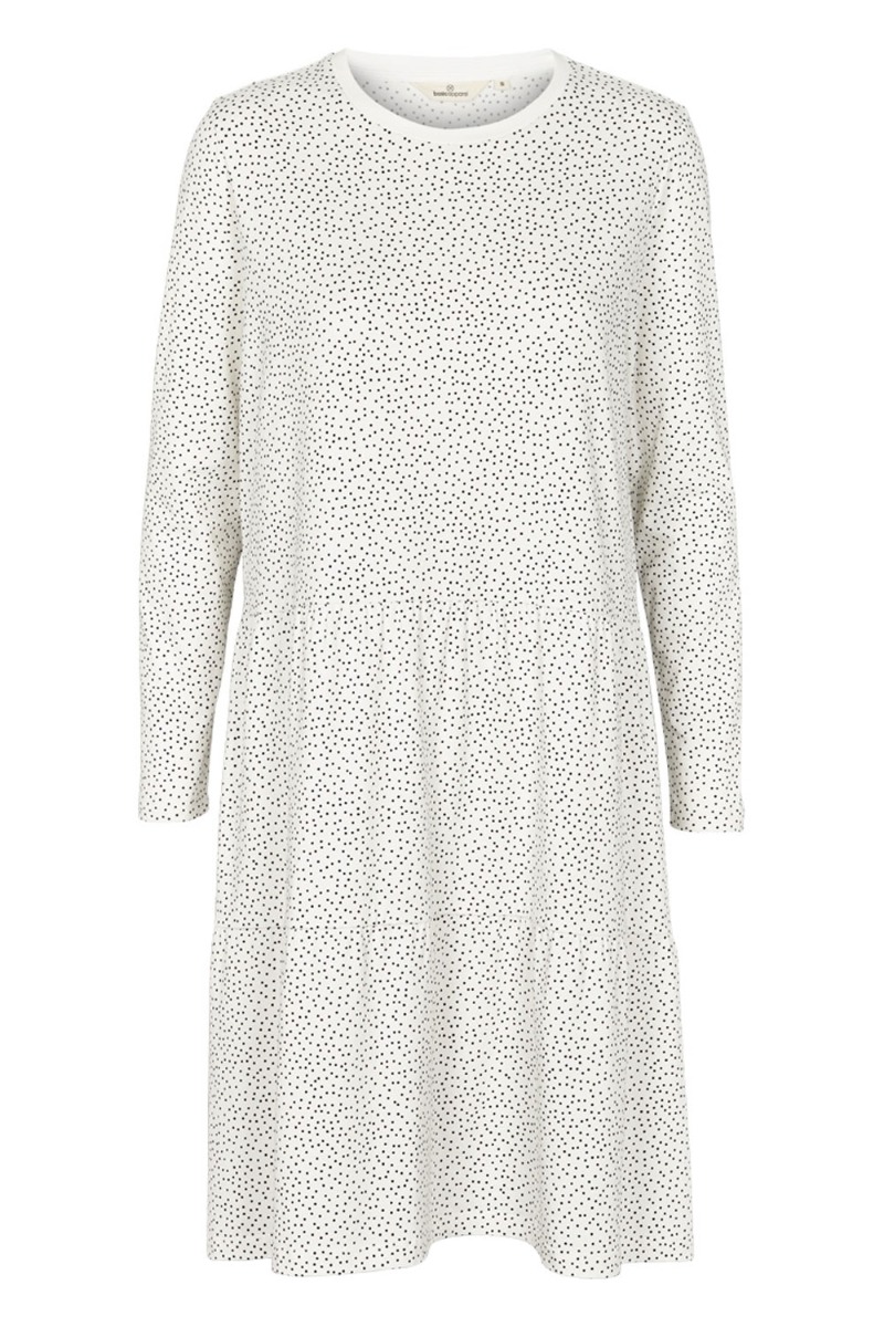Vi kan virkelig ikke undvære disse skønne kjoler fra Basic Apparel der er lavet i den dejligste kvalitet i økologisk bomuld med stretch. Bundfarven er hvid med små sorte prikker i en rummelig model med peplum. Kjolen har lange ærmer og rund udskæring. Style dem med de matchende leggings for et rigtig hyggeligt hverdagssæt.