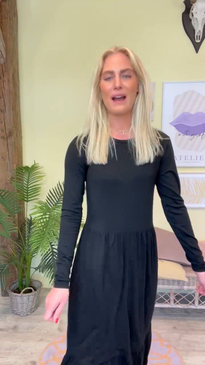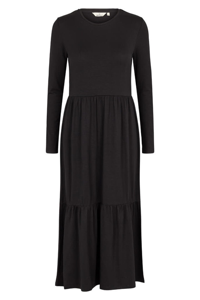 En klassisk sort kjole fra Basic Apparel med peplum i en lang model der giver et taknemmeligt snit. Kjolen er lavet i den lækreste bløde kvalitet der heller ikke krøller særlig meget, hvilket vi elsker hos Lykke by Lykke. Den er løs med rund hals og lange ærmer. Kjolen er tidsløs og kan derfor styles året rundt.