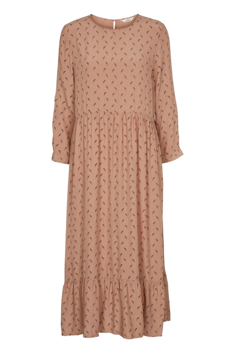 Dejlig luftig kjole fra Basic Apparel i et taknemmeligt løst snit med rund hals. Bundfarven er beige med et fint lille sort blad mønster og kan styles med et par støvler til efteråret og samtidig bruges igen til somemren med en sandal.