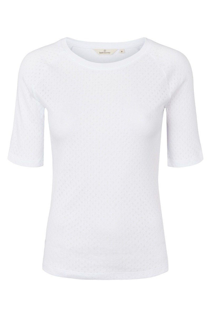 Klassisk simpelt t-shirt fra Basic Apparel med det fineste lille hullet mønster. Den er lavet i det blødeste 100% økologiske bomuld, hvilket gør den helt fantastisk at have på. Modellen er lettere tætsiddende med masser af stræk og rund halsudskæring. Style den til alle dine shorts, jeans eller en nederdel for et mere simpelt udtryk.